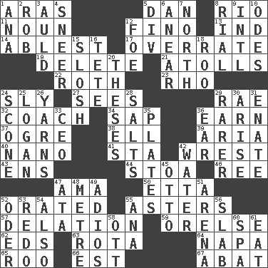 ACROSS 1. Caspian sea tributary 5. One of the 12 tribes of Israel 8. River (Sp.) 11. Part of speech 12. Fine (Spanish) 13. Indiana (abbr.) 14. Most capable 17. Make much ado about nothing 19. Keyboard key 21. Ringlike coral islands and reefs 22. Writer of Portnoy's Complaint (1969) 23. 17th letter of the Greek alphabet 24. Mischievous 27. Perceives with the eye 29. Actress Charlotte 32. Team commander 34. Plant excrement 36. Merit 37. Legendary monster 38. Pipe bend 39. Operatic vocal solo 40. Billionth: prefix 41. R.R. building 42. Obtain by seizing forcibly or violently 43. Followers of ems 44. Portico 46. Portuguese money of account (variant) 47. Wet nurse (var.) 50. Singer James 52. Declaimed 55. Michaelmas daisies 57. Conveyance 59. Threatening words 62. Begley and Asner 63. Roll call or roster of names 64. California wine valley 65. Friend of Pooh 66. Eastern Standard Time (abbr.) 67. Blind as ____ DOWN 1. Santa ___, CA 2. Director Reiner 3. Old (Scot.) 4. Contemptuous expression 5. HTML Container Element 6. Approach 7. Compass direction 8. Monetary unit of Yemen 9. International (abbr.) 10. Lyric poems 12. Enemy 15. Splash clumsily 16. Wig 18. Friend of Pooh 20. College papers 24. Biscuitlike quick bread 25. Utah city north of Ogden 26. Tall tales 28. Table seasonings 29. Less widely known 30. Originate 31. Related on the mother's side 33. Corporate head (abbr.) 35. Food holders 36. Hearing organ 42. Wetness 45. "Beetle Bailey" pooch 47. _ moment's notice (2 wds.) 48. Distance measurement (Brit.) 49. Goodbye (Sp.) 51. Sports stadium 52. River in Europe 53. Do over again 54. In addition 55. Santa ___, CA 56. Thick slice 58. Baseball player Mel 60. Health resort 61. Erode