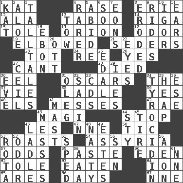 ACROSS 1. Krazy ___ of comics 4. Raze (variant) 8. 4th largest of the Great Lakes 12. According to 13. Off limits 14. Capital of Latvia 15. Lacquered or enameled metalware 17. Greek mythologigal hunter 18. Aroma 19. Shoved, as through a crowd 21. Spring feasts 23. Small child 24. To separate or throw off 26. It is so 27. Patter 28. Passed on 30. Snakelike fish 31. Motion picture awards 34. Definite Article 37. Compete 38. Dipping utensil 39. It is so 40. Raised railways 41. Makes clutter 42. Actress Charlotte 43. Wise men 44. Close up, plug up 46. French article 47. Compass dir. 50. Nervous spasm 51. Exposes to great heat 54. Nineveh was its capital 57. Probability 58. Thick mixture 60. Genesis locale 62. Lacquered or enameled metalware 63. Eroded 64. Electrically charged atom 65. Ancient Greek god of war 66. 24-hour periods 67. Compass dir. DOWN 1. Krazy ___ of comics 2. Medicinal plant 3. Baron Munchausen's specialties 4. More valued for its uncommonness 5. Tolerate 6. "Barney Miller" actor Jack 7. Immeasurably long periods of time 8. Worn away 9. Amusement-park features 10. Composer Stravinsky 11. Hearing organs 13. Pull behind 16. Inky black, to poets 20. Baseball player Mel 22. Sight organs 25. Peak District village in England 27. To provide with a ceiling 29. Angers 30. Night before a holiday 31. Cassini of fashion 32. Indian antelope 33. Music discs 34. Polypeptide antibiotic 35. Pile 36. Compass dir. 41. Vertical spar for supporting sails 43. Makes clutter 44. Filthy place 45. Hoop that covers a wheel 46. Dipping utensil 48. Smutty 49. _____ Park, CO 51. Roll call or roster of names 52. Aroma 53. Hurried 55. Elected rep. 56. Age 59. American Automobile Association (abbr.) 61. Compass dir.