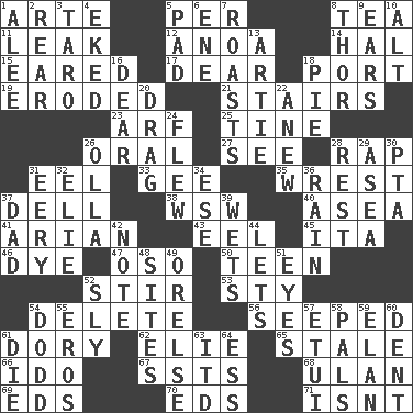 ACROSS 1. Johnson of "Laugh-In" 5. For each 8. Afternoon social gathering 11. Path through which fluid escapes 12. Small Philippine buffalo 14. Actor Linden 15. Having ears or earlike features 17. Letter starter 18. Left side of a ship or aircraft 19. Eaten away 21. Flight of steps 23. Sandy's bark 25. Prong on a fork 26. Taken by mouth 27. Perceive with the eye 28. Reproach for some lapse or misdeed 31. Snakelike fish 33. Turn to the right 35. Obtain by seizing forcibly or violently 37. Small valley 38. Compass dir. 40. Toward the sea 41. Believer in; advocate of (suffix) 43. Snakelike fish 45. Call ___ day 46. Color 47. Bear (Spanish) 50. Adolescent 52. Use a spoon 53. Filthy place 54. Erase 56. Oozed 61. Rowboat 62. Writer Wiesel 65. Having lost freshness 66. Wedding promise 67. Fast planes 68. Uhlan (variant) 69. Begley and Asner 70. Begley and Asner 71. Is not DOWN 1. Toward shelter 2. Hitchcock's "____ Window" 3. Pacific island yam 4. Supplemented with great effort 5. Groovy apt. 6. Compass dir. 7. Cooks with dry heat, as in an oven 8. Son of Odin 9. Hearing organs 10. Keyboard modifier key 13. Nick name for Arthur 16. Letter starter 18. Sliced dessert 20. To draw with force 22. Afresh 24. Soared 26. Water jar 28. State of inaction 29. Toward the sea 30. Parent Teacher Association (abbr.) 31. Suggestive of the supernatural 32. Writer Wiesel 34. Compass dir. 36. Water falling in drops from the sky 37. June honoree 39. Moistens 42. Brief written record 44. Allows 48. Locates 49. Threatening words 51. Sight organs 52. Cunning 54. Texas town _ City 55. Greek god of love 57. Needle case 58. Friends 59. Enthusiasm 60. Incision 61. Expire 63. It would 64. Curvy letter