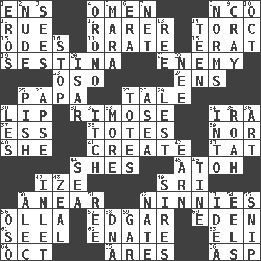 ACROSS 1. Followers of ems 4. Presage 8. Non-commissioned officer (abbr.) 11. Sorrow 12. More valued for its uncommonness 14. Torque (variant) 15. Lyric poems 17. Speak pompously 18. Part of Q.E.F. 19. French poetic form 21. Foe 23. Bear (Spanish) 24. Followers of ems 25. Dad 27. Falsehood 30. Mouth edge 31. Full of chinks, cracks, or crevices 34. Retirement account (abbr.) 37. Double-curved letter 38. Lugs 39. And not 40. A female animal or person 41. Cause to be 43. Make lace 44. "______ My Girl" (Turtles hit) 45. Tiny particle 47. Ending with capital 49. Indian title of respect (Mr.) 50. Approach 52. Fools 56. Water jar 57. _ Allan Poe 60. Paradise 61. Stitch closed the eyes of (a falcon) 62. Maternal 63. Biblical high priest 64. Sep. follower 65. Ancient Greek god of war 66. Cleo's killer DOWN 1. Greek god of love 2. Unadorned 3. Observes 4. U. of Maine site 5. Hindu Mythology: god of death 6. Epoch 7. Fish or hair follower 8. Typical standards 9. Supercomputer manufacturer 10. Sep. follower 13. To separate or throw off 14. Adolescent 16. Close up, plug up 20. Astrian river, tributary to the Danube 22. Born 25. Expression of disdain 26. Domed church section 27. Lugs 28. At sea 29. For fear that 30. French article 32. Hankering 33. Greater amount 34. To the inside or interior of 35. Wander 36. Nonscientific branch of learning 42. Merit 44. Ocean 46. Prong on a fork 47. An arm off of a larger body of water 48. Ardor 49. Fathers 50. Actor Baldwin 51. Portuguese money of account (variant) 52. Nathan's nickname 53. The content of cognition 54. Snakelike fish 55. Clip 56. Bear (Spanish) 58. Heredity factor (abbr.) 59. Slender fish