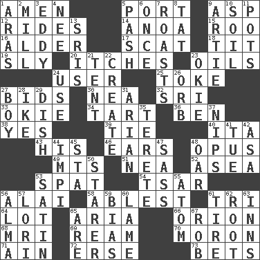 ACROSS 1. So be it 5. Left side of a ship or aircraft 9. Viper 12. Amusement-park features 14. Small Philippine buffalo 15. Friend of Pooh 16. Tree or shrub in the Birch family 17. Scram! 18. Teat (slang) 19. Insidious 20. Skin irritations 23. Lubricates 24. One who makes use of a thing 25. Puff or smoke 27. Auction offers 30. Teachers' org. 32. _ Lanka 33. Migrant worker of the '30s 34. Small pie 36. Benjamin's nick name 38. Consenting reply 39. Neckwear 40. Call ___ day 43. Part of HMS, perhaps 46. Hearing organs 48. Musical composition 49. Mountains (abbr.) 51. Teachers' org. 52. Toward the sea 53. Petty quarrel 54. Russian ruler of old 56. Jai _ 58. Most capable 61. Three (prefix) 64. Car dealer's back yard 65. Operatic vocal solo 66. Greek mythologigal hunter 68. Medical imaging device (abbr.) 69. 480, 500 or 516 sheets of paper 70. Person of subnormal intelligence 71. The 18th letter of the Arabic alphabet 72. Celtic language 73. Wagers DOWN 1. Ancient river in northeast Turkey 2. Place where flour is made 3. Whirlpool 4. Born 5. Romantic infatuation 6. At one time in the past 7. Ridicules or criticizes harshly 8. Make lace 9. Nick name for Arthur 10. Land 11. Plant holders 13. Indian titles of respect 21. Portable shelter 22. Make 23. Migrant worker of the '30s 24. Purpose 26. Globe 27. Male child 28. D.D.E's nickname 29. Food container 31. Believer in; advocate of (suffix) 35. Cigar-shaped 37. Cuts off 41. Third day of the wk. 42. White ___ sheet 44. Body of Kaffir warriors 45. R.R. building 47. Backtalk 48. Rowing implement 50. A viewer who gazes fixedly 53. Smooth fabric 55. Tiny particle 56. _ mater 57. Australian parrot (variant) 59. Prejudice 60. Unable to walk 61. Hoop that covers a wheel 62. Carrot, for example 63. Restaurants 65. "We ___ not amused" (Victoria) 67. Director Reiner