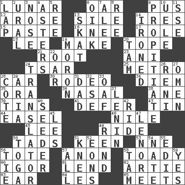 ACROSS 1. Type of eclipse 6. Boat paddle 9. Fluid product of inflammation 12. Came up 13. Drop; flow; fall 14. Angers 15. Thick mixture 16. Leg joint 17. Hero or heavy, e.g. 18. Area sheltered from the wind 19. Cause to be 20. Drink excessively 21. Carrot, for example 23. Black tropical American cuckoo 24. Russian ruler of old 25. Paris' subway 28. Auto 30. Cowboy competition 34. South Vietnam president (1954) 35. Mouth or opening 36. Rhinal 38. One (Scot) 39. Airtight sealed metal containers 41. Put off 43. Metal container 44. Artist's stand 46. The longest river in the world 48. Area sheltered from the wind 49. Travel on or in a vehicle 50. Bits 51. Peachy ____! 53. Compass dir. 56. Haul 57. Soon (poet.) 58. Sycophant 60. Composer Stravinsky 61. Grant temporary use of 62. Nick name for Arthur 63. Ewer handle 64. French article 65. Confronts DOWN 1. Infant locale 2. Mountain range 3. Sense of smell 4. Michaelmas daisies 5. To separate or throw off 6. Pig sound 7. Toward shelter 8. To separate or throw off 9. Appease 10. Ubangi River tributary 11. Compass dir. 13. Three-handed card game 14. Pressed 19. Person of subnormal intelligence 20. Scottish cap 22. Boat paddle 24. Interpreter 26. Painter Guido (1575-1642) 27. Sign of something about to happen 28. ____ d'Azur (French Riviera) 29. Roberta Peters solo 31. Male parent 32. Compass dir. 33. Clumsy lout 37. Soviet premier 1918-24 40. Sowing specialist 42. To free from 45. French article 47. Poe poem 49. Tear apart 50. Ancient Roman robe 51. Leg joint 52. Immeasurably long periods of time 54. Nathan's nickname 55. Prepare for publication 56. Neckwear 57. Everything 58. Scottish cap 59. Affirmative reply
