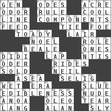 ACROSS 1. Commissioned mil. rank 4. Lyric poems 8. Measure of real estate 12. Scent 14. General guideline 15. Calm and collected 16. Actor's bit 17. Pieces 20. Nourish 21. Make a knot 22. Enemy 23. Sycophant 27. Den 29. Christmas carol 31. Hero or heavy, e.g. 34. Memphis, Tenn. Street 35. Washington bills 36. "You Light Up My Life" star Conn 39. Pet locale 41. Nuclear Threat Initiatives 42. Baltic tributary 43. Amusement-park features 46. Exchanged or delivered for money 47. Famous astronaut Armstrong 48. Toward the sea 51. Major League Baseball Commissioner Bud 54. Dripping 56. Epoch 58. Turn sharply 61. The property of being fit to eat 66. Naked 67. Small Philippine buffalo 68. Butter sub 69. Pull into pieces 70. Austrian-born American filmmaker Fritz 71. Actor Alda or Thicke 72. Secret DOWN 1. Eighteen holes 2. Singer Brickell 3. Music written for nine 4. The grampus (Milton) 5. Superhero pair 6. Shade tree 7. Back-to-school mo. 8. Adept person 9. Meet 10. Printing process, for short 11. Otherwise 13. Make new 18. Petroleum 19. Teachers' org. 24. A saturated hydrocarbon 25. ___ good deed 26. Shout 28. Metal shackles 30. Acquire or gain knowledge or skills 32. Flowery wreath 33. Curvy letter 34. Avian creatures 36. Two (Sp.) 37. Wedding promise 38. Conveyance 40. Sliced desserts 44. Expire 45. Pipe bend 49. Snakelike fish 50. "We ___ not amused" (Victoria) 52. Is not 53. Cements 54. Welt 55. Pulitzer Prize-winning author Ferber 57. Small Philippine buffalo 59. Freehold land 60. Suggestive of the supernatural 62. Paper or plastic container 63. Pipe bend 64. Ocean 65. Manchild