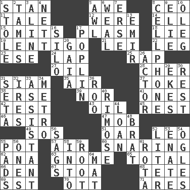 ACROSS 1. Comedian Laurel of Laurel & Hardy 5. Deep reverence 8. Corporate head (abbr.) 11. Lie 12. We are 14. Pipe bend 15. Leaves out 17. Suffix with ecto or cyto 18. Falsehood 19. Small, flat, pigmented spot on the skin 21. Flowery wreath 22. Part of a journey 23. Compass dir. 24. Infant locale 25. Hit sharply and swiftly 27. Lubricate 28. "Mermaids" star 31. Thailand, formerly 35. Wind 37. Casino tip 38. Celtic language 39. And not 41. Singles 42. Trial 43. Lubricate 45. State of inaction 46. SW Saudi Arabia district 47. Crowd into 49. Distress signal 51. Boat paddle 52. Lion 55. Plant holder 57. Atmosphere 60. Catching in a trap 62. Santa ___, CA 63. Dwarf 65. "_____ Recall" 66. Lair 67. Portico 68. Wig 69. Fast jet (abbr.) 70. Baseball player Mel 71. Ancient Greek god of war DOWN 1. Took without asking 2. Softens 3. Place in a line 4. Remaining after all deductions 5. Leather borer 6. Welt 7. Celtic language 8. Portable communications device 9. Writer Wiesel 10. Cassini of fashion 13. Arab leader 16. Grain storage tower 17. Cotton for raincoats, e.g. 20. Greek goddess of the earth (variant) 26. Thespian 29. Supplements with great effort 30. Take ten 31. Stalk of a moss capsule 32. Angers 33. Helper 34. Paris' subway 36. Friend of Pooh 40. Full of chinks, cracks, or crevices 44. Grant temporary use of 48. Naughty child 50. Sinks 52. 61 cubic inches 53. Related on the mother's side 54. Stares at amorously 55. Groovy apts. 56. Washington bills 58. To the inside or interior of 59. Carrot, for example 61. Round or rotation of duties 64. Floor protector