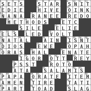 ACROSS 1. Arranges properly for use 5. Play the lead 9. In a ____ (agitated or irritated) 13. Singer Brickell 14. Hub of activity 15. Pig sound 16. Nanny 17. The wife of a rajah (variant) 18. Do over again 19. Modes 21. And so on (abbr.) 22. Filth; sediment 23. Writer Wiesel 24. Raised railways 27. Directed 28. Electrical Unit 29. Relating to or accompanying birth 31. The 18th letter of the Arabic alphabet 32. Is not 36. "Vaya con ____" 37. She-sheep 38. Brightly colored fish 39. Mouths or openings 40. Actor Linden 41. Related on the mother's side 42. Russian composer Stravinsky 44. Baseball player Mel 46. Marina Del _, California 47. Inconspicuous attention getter 48. Printing process, for short 50. "One Day ___ Time" 51. Deli grouping 54. Dad 56. Declaim 58. A distinct part 60. So be it 61. Hoop that covers a wheel 62. Jacques of French films 63. Piece 64. Frog relative 65. Volcanic refuse DOWN 1. Elected rep. 2. Dutch treat 3. Prong on a fork 4. Theater features 5. Cast a shadow over 6. Metal containers 7. "___ Maria" 8. To separate or throw off 9. Decision 10. Sibling's daughter 11. Working for oneself (abbr.) 12. Ring climax 17. Hero or heavy, e.g. 20. Land elevation 21. Pipe bend 23. Age 24. Inside; within (prefix) 25. Den 26. Portico 28. Compete 30. Helper 31. Leather borer 33. Coast Guard woman 34. Nathan's nickname 35. Those people 37. Ewer handle 40. Being at a high temperature 41. Singer James 43. Girls' org. (abbr.) 44. Spoke pompously 45. Lacquered or enameled metalware 47. Some stationery 49. Leaves out 51. "Two Mules for Sister ____" 52. Slanted text style (abbr.) 53. Stalk of a moss capsule 54. Infant food 55. Nanny (var.) 56. Baseball player Mel 57. River (Sp.) 59. Russian fighter aircraft