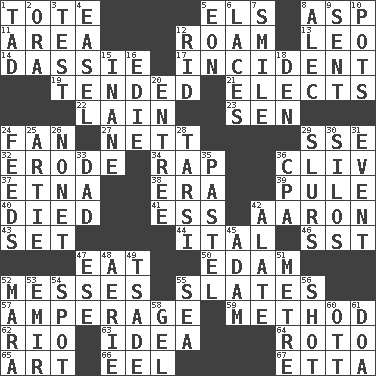 ACROSS 1. Carryall 5. Raised railways 8. Cleo's killer 11. Type of rug 12. Wander 13. Lion 14. Small ungulate mammals of Africa 17. Happening 19. Looked after 21. Chooses 22. (Had) reclined 23. Elected rep. 24. Avid follower 27. Remaining after all deductions 29. Compass dir. 32. Eat (away) 34. Hit sharply and swiftly 36. 154 in Roman numerals 37. Inactive volcano in Sicily 38. Period 39. Whimper 40. Passed on 41. Curvy letter 42. Composer Copland 43. Arrange properly for use 44. Slanted text style (abbr.) 46. Fast jet (abbr.) 47. Consume 50. Dutch treat 52. Makes clutter 55. Chalkboards 57. Electrical Measurement 59. Mode 62. River (Sp.) 63. The main thing one is thinking about 64. Printing process, for short 65. Tate display 66. Snakelike fish 67. Singer James DOWN 1. Small boy 2. Mouth or opening 3. Trial 4. Artist's stand 5. Period of immesurable duration 6. Shoestrings 7. Grin 8. Actor Baldwin 9. Transmitted 10. Plant holders 12. To free from 15. Silly 16. Singer Brickell 18. Lair 20. Main course 24. Gives food to 25. Nick name for Arthur 26. Music written for nine 28. Tarsus (plural) 29. Plays smoothly or legato 30. Grain storage towers 31. Happening 33. Male parent 35. Soft color 36. Accounting whiz (abbr.) 42. Having winglike extensions 45. First man 47. Compass dir. 48. Nest on high 49. Sadhe (variant) 51. Distance measurement (Brit.) 52. Hindu Mythology: god of death 53. Independent ruler or chieftain 54. Blemish 55. Ocean 56. Attempt 58. Set 60. Baseball player Mel 61. ___ good deed