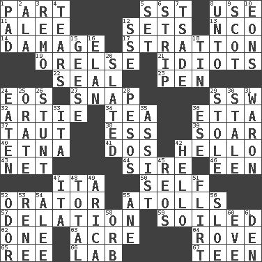 ACROSS 1. Role in a play 5. Fast jet (abbr.) 8. Purpose 11. Toward shelter 12. Puts into a specified state 13. Non-commissioned officer (abbr.) 14. Break 17. Ski resort town in Vermont 19. Threatening words 21. Foolish or stupid persons 22. Lick closed 23. Writing instrument 24. Greek goddess of the dawn 27. Fastener 29. Compass dir. 32. Nick name for Arthur 34. Afternoon social gathering 36. Singer James 37. Tense 38. Curvy letter 39. Fly high 40. Inactive volcano in Sicily 41. Two (Sp.) 42. Phone greeting 43. Fish or hair follower 44. The founder of a family 46. Car or cant ending 47. Call ___ day 50. Automatic 52. Speaker 55. Ringlike coral islands and reefs 57. Conveyance 59. Dirtied 62. Single 63. 1/640 square mile 64. Be footloose 65. To sift 66. Experiment locale 67. Adolescent DOWN 1. Groovy apt. 2. Insect wing 3. San ____ (Riviera town) 4. Rends 5. Arrange properly for use 6. Empty completely 7. Sadhe (variant) 8. To (old English) 9. Highlander 10. Immeasurably long periods of time 12. Compass dir. 15. Honkers 16. Liveliness 18. Metal container 20. Scheduled 24. Consumed 25. Speak pompously 26. Difficult or unusual or dangerous feat 28. Mexican monetary units 29. Took without asking 30. Having lost freshness 31. Make _____ (do battle with) 33. Call ___ day 35. Aid 36. Compass dir. 42. Phone greeting 45. Vintage cars 47. Call ___ day 48. Add up to 49. N. Chile seaport 51. Seductive woman who exploits men 52. Aroma 53. French philosopher Descartes 54. Toward shelter 55. One (Scot) 56. _ gin 58. Globe 60. First lady 61. Lair
