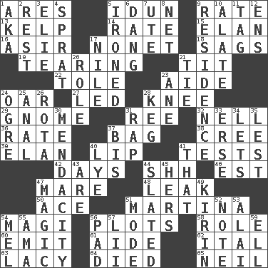 ACROSS 1. Ancient Greek god of war 5. Goddess of spring and wife of Bragi 9. Assign a rank or rating to 13. Seaweed 14. Assign a rank or rating to 15. Enthusiasm 16. SW Saudi Arabia district 17. Music written for nine 18. Settles 19. Separating forcefully 21. Teat (slang) 22. Lacquered or enameled metalware 23. Assistant 24. Rowing implement 27. Directed 28. Leg joint 29. Dwarf 31. To riddle 32. 1994 drama film starring Jodie Foster 36. Pace 37. Paper or plastic container 38. Algonquian 39. Style 40. Mouth edge 41. Trials 42. 24-hour periods 44. Quiet! 46. Eastern Standard Time (abbr.) 47. Female horse 48. Path through which fluid escapes 50. Adept person 51. Chrissie's court nemesis 54. Wise men 56. Small pieces of grounds 58. Hero or heavy, e.g. 60. Send forth 61. Helper 62. Slanted text style (abbr.) 63. Made of lace 64. Passed on 65. Famous astronaut Armstrong DOWN 1. Alias (abbr.) 2. Take ten 3. Writer Wiesel 4. Small fatty European fish 5. Pressed 6. Mild oath, euphamism for damn 7. Shoshoni 8. Fish or hair follower 9. Dwelling 10. Having winglike extensions 11. Label 12. Followers of ems 17. The longest river in the world 20. Hero or heavy, e.g. 21. Neckwear 23. One (Scot) 24. Legendary monster 25. Of or related to the anus 26. Roll call or roster of names 28. Barrel 30. Ananias' fault 31. Hit sharply and swiftly 33. Celtic language 34. Allows 35. For fear that 37. Twice 40. Sodium hydroxide 41. Not this but _ 43. "We ___ not amused" (Victoria) 44. Scheduled 45. Possessive pronoun 47. Mysterious quality of enchantment 49. Japanese brewing company 51. Method 52. Brief written record 53. Jai _ 54. Cartoonist voice _ Blanc 55. Nanny (var.) 56. Groovy apt. 57. Cards in a Roman deck? 59. Pipe bend
