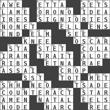 ACROSS 1. Deep reverence 4. Singer James 8. Arranges properly for use 12. Unable to walk 14. U. of Maine site 16. The main thing one is thinking about 17. Angers 18. Seigniories (variant) 20. Music written for nine 22. Pipe bend 23. Followers of ems 24. Conclude 25. Shade tree 28. Observe 30. Leg joint 31. Witty Wilde 35. R.R. building 37. Proofreading order 40. Root beer relative 41. SW Asia republic 42. Distinguishing feature 44. _ vera 45. Teases 46. Inactive volcano in Sicily 47. Actress Charlotte 48. Slender Brazilian palm 50. Riding implement 52. Fast jet (abbr.) 54. Small child 55. Was introduced to 58. Quiet! 61. Modern: prefix 63. Sadhe (variant) 65. Neutralize 70. Play the lead 71. So be it 72. Relating to or accompanying birth 73. Snakelike fish 74. Connecting point 75. Drug cop 76. To separate or throw off DOWN 1. Place in a line 2. Make _____ (do battle with) 3. Make improvements or corrections to 4. Greek goddess of the dawn 5. Three (prefix) 6. Coat; cloak 7. Singer Murray 8. Title for a knight 9. Singer Brickell 10. Adolescent 11. Backtalk 13. Compass dir. 15. Lubricates 19. Margarine 21. "___ Little Indians" 26. For fear that 27. Distance measurement (Brit.) 29. Fortification 30. Sunflower state 32. Root beer relative 33. Medicinal plant 34. Actress Charlotte 35. Indian titles of respect 36. Bar bills 38. Ingest 39. Colored lightly or faintly 41. Lyricist Gershwin 43. Pacific island yam 49. Is not 51. Baseball player Mel 53. Adolescent 55. Mother 56. Peak District village in England 57. Laconic 58. Examine hastily 59. Same (prefix) 60. Became colored 62. Northwest Algerian city 64. Compass dir. 66. Compass dir. 67. "One Day ___ Time" 68. 4-wheeled motor vehicle 69. Affectionate concern, for short