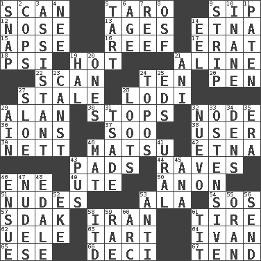 ACROSS 1. Examine hastily 5. Pacific island yam 9. Small drink 12. Sense of smell 13. Grows older 14. Inactive volcano in Sicily 15. Domed church section 16. Coral collection 17. Part of Q.E.F. 18. Air pressure measure (abbr.) 19. Being at a high temperature 21. Place in a line 22. Glance over 24. Nine, plus one 26. Writing instrument 27. Having lost freshness 28. Farming town in central California 29. ____ Jay Lerner 30. Ceases 32. Connecting point 36. Charged particles 37. "Barney Miller" actor Jack 38. One who uses or employs something 39. Remaining after all deductions 40. Taiwanese island in East China Sea 42. Inactive volcano in Sicily 43. Writing tablets 44. All-night dance parties 46. Compass dir. 49. Shoshoni 50. At once, immediately (arch.) 51. Unclothed pictures 53. In the manner of 54. Mayday 57. Neighbor of Neb. 58. SW Asia republic 61. Hoop that covers a wheel 62. Ubangi River tributary 63. Small pie 64. _ the terrible 65. Compass dir. 66. Tenth: prefix 67. Look after DOWN 1. Fastener 2. 911 reaches them 3. Helper 4. Born 5. Small pie 6. Mature 7. To sift 8. Order of Saint Francis (abbr.) 9. Remove all contents or possession from 10. Empty; void 11. Eucharist need 14. Snakelike fish 19. Actor Linden 20. Singles 21. Cuckoo 23. 2nd pers. sing. pres. of can (arch.) 24. Literary convention 25. Begley and Asner 27. _ gin 28. Plunders 29. The 18th letter of the Arabic alphabet 31. Sadhe (variant) 32. New (sp.) 33. Clearly or manifestly demonstrative 34. Cub Scout units 35. Period 40. Floor covering 41. Mountain range 43. Fluid product of inflammation 45. Santa ___, CA 46. Follow as a consequence or result 47. Unadorned figures 48. Peak District village in England 52. Make supply last 53. Against 55. NW Algerian seaport 56. Post 58. It would 59. Actress Charlotte 60. Curve 61. Teat (slang)