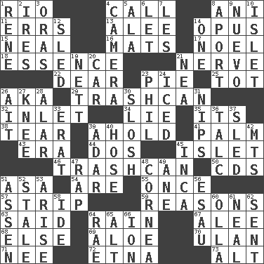ACROSS 1. _ de Janeiro 4. Give a ring to 8. Black tropical American cuckoo 11. Blunders 13. Toward shelter 14. Musical composition 15. Be tempered by heat 16. Floor coverings 17. Christmas carol 18. Center 21. Impudent aggressiveness 22. Letter starter 23. Sliced dessert 25. Small child 26. Alias (abbr.) 29. File 13 32. An arm off of a larger body of water 34. Falsehood 35. ___ a Wonderful Life 38. Pull apart 39. Hold, grip (Informal) 41. Inside of hand 43. Period 44. Two (Sp.) 45. Small island 46. File 13 50. Music discs 51. White ___ sheet 54. "We ___ not amused" (Victoria) 55. At one time in the past 57. Remove all contents or possession from 59. Thinks logically 63. Stated 64. Precipitation 67. Toward shelter 68. Otherwise 69. Medicinal plant 70. Uhlan (variant) 71. Born 72. Inactive volcano in Sicily 73. Keyboard modifier key DOWN 1. French philosopher Descartes 2. Angers 3. Mouths or openings 4. Device for capturing images 5. Wing 6. Allow 7. French article 8. To the left, to Queeg 9. New (sp.) 10. Small island 12. Downhill vehicle 14. Single 19. Remaining after all deductions 20. Automobile 21. Teachers' org. 23. Silvers or Donahue 24. On the rocks 26. Small island 27. Leg joint 28. Having or resembling wings 30. Splash clumsily 31. Cuts off 33. Part of Q.E.F. 36. Baby powder 37. Downhill vehicle 39. The sixth month of the Jewish calendar 40. Stockings 42. Mountains (abbr.) 45. South American Indian 47. Reproach for some lapse or misdeed 48. Pupil covering 49. One (Scot) 51. NE Netherlands city 52. Lacking originality or spontaneity 53. Originate 56. He sold his birthright 58. Binary compound 60. Spanish pot 61. Be tempered by heat 62. Emitted 64. Actress Charlotte 65. Keyboard modifier key 66. Electrically charged atom
