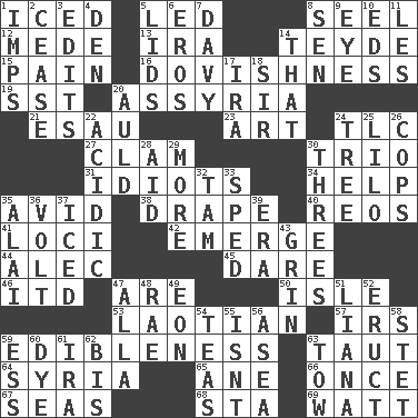 ACROSS 1. On the rocks 5. Directed 8. Sew up the eyelids of hawks and falcons 12. Ancient Persian 13. Lyricist Gershwin 14. Miss Universe 1986, Barbara Palacios _ 15. Ache 16. Innocence, gentleness, or tenderness 19. Fast jet (abbr.) 20. Nineveh was its capital 21. He sold his birthright 23. Tate display 24. Affectionate concern, for short 27. Dollar (slang) 30. Musical group of three 31. Foolish or stupid persons 34. Assist 35. Enthusiastic 38. Window treatment 40. Vintage cars 41. Venues 42. Develop 44. Actor Baldwin 45. Have the gumption 46. It would 47. "We ___ not amused" (Victoria) 50. Small island 53. Of or relating to Laos or its people 57. Big collection agency 59. The property of being fit to eat 63. Tense 64. Damascus' land 65. A saturated hydrocarbon 66. At one time in the past 67. Oceans 68. R.R. building 69. Electrical Unit DOWN 1. Naughty children 2. Stop 3. Proofreads 4. Lair 5. Flaplike coverings 6. Greek god of love 7. _ Jones??? Locker 8. Elected rep. 9. Sight organ 10. Begley and Asner 11. French article 14. Not this but _ 17. Retirement account (abbr.) 18. Title for a knight 20. Old (Scot.) 22. Being or containing an acid 24. Woody plant 25. _ and Stitch 26. 911 reaches them 28. Help 29. Greater amount 30. Triplets 32. Scottish cap 33. Broke a traffic law 35. Mountain range southwest of Kyrgyzstan 36. Electrical Unit 37. On the rocks 39. Epoch 43. Amused look 47. Silent film actress Nazimova 48. Actress Charlotte 49. A really long time 51. Climbing, woody, usually tropical vines 52. Spew [out] 54. Beverages made from leaves 55. Is not 56. Toward the sea 58. Proofreading order 59. Curvy letter 60. Color 61. Lyricist Gershwin 62. Altar cloth linen 63. Pull behind