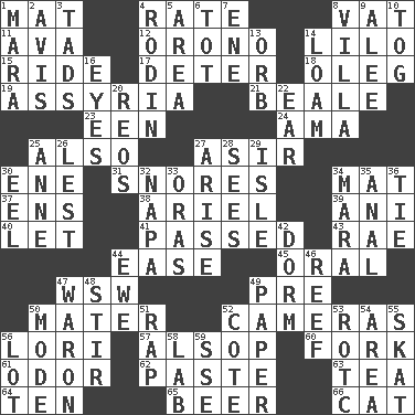 ACROSS 1. Floor protector 4. Pace 8. Large container 11. Actress Gardner 12. U. of Maine site 14. _ and Stitch 15. Travel on an animal 17. Prevent from occurring 18. Cassini of fashion 19. Nineveh was its capital 21. Memphis, Tenn. Street 23. Car or cant ending 24. Nursemaid (var.) 25. In addition 27. SW Saudi Arabia district 30. Compass dir. 31. Sounds asleep 34. Floor covering 37. Followers of ems 38. Satellite of Uranus 39. Cuckoo 40. Allow 41. Went by 43. Actress Charlotte 44. Relaxation 45. Relating to the mouth 47. Compass dir. 49. Before (prefix) 50. Mother 52. Devices for capturing images 56. Australian parrot (variant) 57. Columnist Joseph or Stewart 60. Tined utensil 61. Aroma 62. Thick mixture 63. Beverage made from leaves 64. "___ Little Indians" 65. Fermented drink made from hops 66. Domesticated feline DOWN 1. Hindu Mythology: god of death 2. Advice 3. Small boys 4. "The Thinker" sculptor 5. Type of rug 6. Small child 7. Compass dir. 8. Country estate 9. Toward shelter 10. Coat; cloak 13. Globe 14. Rich soil 16. Sight organs 20. Vintage cars 22. Ewer handle 25. Singer Murray 26. For fear that 27. Originate 28. Perceives with the eye 29. Small island 30. Snakelike fish 32. California wine valley 33. Mouths or openings 34. Hindu Mythology: god of death 35. Of or related to the anus 36. Make a knot 42. Dormintory (informal) 44. She-sheep 46. Coral collection 47. Make _____ (do battle with) 48. Agitate 49. Some stationery 50. Method 51. Strike 52. ____ d'Azur (French Riviera) 53. College mil. group 54. Length times width 55. Three-handed card game 56. Car dealer's back yard 58. Experiment locale 59. Compass dir.