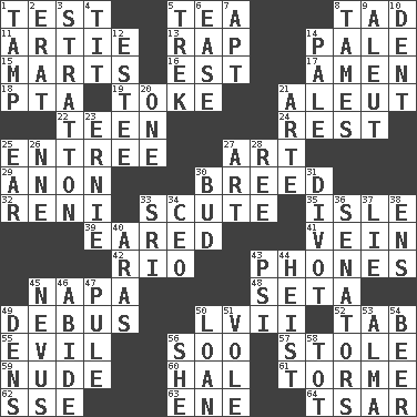 ACROSS 1. Trial 5. Beverage made from leaves 8. Small amount or degree 11. Nick name for Arthur 13. Hit sharply and swiftly 14. Diluted with white 15. Shops 16. Eastern Standard Time (abbr.) 17. So be it 18. Parent Teacher Assoc. 19. Puff or smoke 21. Eskimo relative 22. Adolescent 24. Relief 25. Main course 27. Nonscientific branch of learning 29. At once, immediately (arch.) 30. A special lineage 32. Painter Guido (1575-1642) 33. Scutum 35. Small island 39. Having ears or earlike features 41. Distinctive style or manner 42. _ de Janeiro 43. Gives a jingle 45. California wine valley 48. Stalk of a moss capsule 49. Alight from a bus 50. 57 in ancient Rome 52. Keyboard key 55. Tending to cause great harm 56. "Barney Miller" actor Jack 57. Took without asking 59. Unadorned 60. Actor Linden 61. Singer Mel 62. Compass dir. 63. Compass dir. 64. Russian ruler of old DOWN 1. Pack (down) 2. Part of Q.E.F. 3. Ski resort town in Vermont 4. Teat (slang) 5. Long journey 6. Relaxation 7. Fitting 8. Makes less strong or intense 9. Eskimo relative 10. Incision 12. First name in cosmetics 14. Light colored 20. Single 21. Johnson of "Laugh-In" 23. Bert's buddy 25. Ewer handle 26. Compass dir. 27. Tate display 28. To sift 30. Partially opened flower 31. A piece of turf (Scot.) 33. Indian title of respect (Mr.) 34. Corporate head (abbr.) 36. Legislators 37. Untruth 38. Followers of ems 40. Caspian sea tributary 43. Air pressure measure (abbr.) 44. Robbery 45. Congenital growth or mark on the skin 46. Tolerate 47. Whimper 49. Cub Scout units 50. Grant temporary use of 51. Grand slam 53. _ mater 54. Fermented drink made from hops 56. A female animal or person 58. Small child