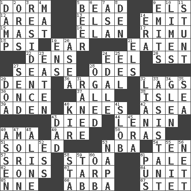 ACROSS 1. Dormintory (informal) 5. Necklace unit 9. Raised railways 12. Length times width 13. Otherwise 14. Send forth 15. Vertical spar for supporting sails 16. Enthusiasm 17. Tall New Zealand timber tree 18. Air pressure measure (abbr.) 19. Ewer handle 21. Eroded 22. Hiding places for outlaws 24. Snakelike fish 26. Fast jet (abbr.) 27. Gospel singer Marvin 28. Lyric poems 29. Gouge 30. Therefore, facetiously 32. Falls behind 36. Single time 37. Everything 38. Capri or Wright 39. An important port of Yemen 40. Leg joints 42. Toward the sea 43. Passed on 44. Soviet premier 1918-24 46. Wet nurse (var.) 49. "We ___ not amused" (Victoria) 50. Mouths or openings 51. Having a sole or soles 53. Basketball assoc. 54. "___ Little Indians" 57. Indian titles of respect 58. Portico 61. Diluted with white 62. Immeasurably long periods of time 63. Canvas cover 64. A single undivided whole 65. Compass dir. 66. Swedish rock group 67. Proofreading order DOWN 1. Moist 2. Mouths or openings 3. Home 4. Floor protector 5. Fermented drink made from hops 6. Pipe bend 7. White ___ sheet 8. Lair 9. Sends forth 10. Citrus fruits 11. Difficult or unusual or dangerous feat 14. Period 19. Followers of ems 20. Toward the sea 21. Raised railways 23. Eroded 24. Peak District village in England 25. Snakelike fish 27. Transmit 28. Stared 29. ___ good deed 31. Indian princess (variant) 32. Climbing, woody, usually tropical vines 33. Helper 34. Small, secluded valley 35. Ocean 40. Apertif with cassis 41. Messy guy 43. June honoree 45. Period 46. NE Netherlands city 47. Person of subnormal intelligence 48. Place in a line 52. Double-curved letter 53. California wine valley 55. Writer Wiesel 56. Remaining after all deductions 58. R.R. building 59. Bar bill 60. Globe 61. Ichor