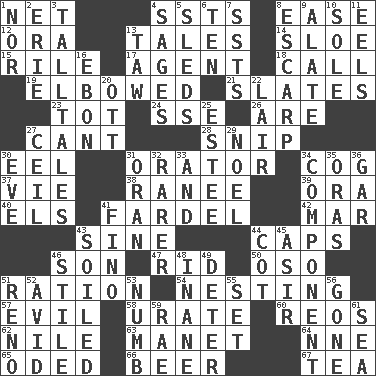 ACROSS 1. Fish or hair follower 4. Fast planes 8. Comfort 12. Mouth or opening 13. Stories 14. _ gin 15. Cause heat under the collar 17. Rep 18. Give a ring to 19. Shoved, as through a crowd 21. Chalkboards 23. Small child 24. Compass dir. 26. "We ___ not amused" (Victoria) 27. Patter 28. Clip 30. Snakelike fish 31. Speaker 34. Gear tooth 37. Compete 38. Indian princess (variant) 39. Mouth or opening 40. Raised railways 41. Pack 42. Third mo. 43. Trig term 44. Balmoral and tarboosh 46. Manchild 47. To free from 50. Bear (Spanish) 51. Food allowance for one day 54. Inhabiting a nest 57. Morally bad or wrong 58. A salt of uric acid 60. Vintage cars 62. Mediterranean tributary 63. French painter Edouard 64. Compass dir. 65. Wrote a lyric poem 66. Fermented drink made from hops 67. Beverage made from leaves DOWN 1. And not 2. 4th largest of the Great Lakes 3. Baron Munchausen's specialties 4. Gurus 5. Bobsleighs 6. "___ Little Indians" 7. Fast planes 8. Fortification 9. Having winglike extensions 10. Flatfish 11. Snakelike fish 13. The 23rd letter of the Hebrew alphabet 16. Inky black, to poets 20. Baseball player Mel 22. Den 25. First name in cosmetics 27. To provide with a ceiling 29. Christmas carol 30. Night before a holiday 31. NW Algerian seaport 32. More uncommon 33. Plus 34. Piece 35. Mouths or openings 36. Slender fish 41. A pale, very dry sherry 43. Dirtied 44. Small bed 45. SW Saudi Arabia district 46. Vertical member of a panel or frame 48. Empty; void 49. Prevent from occurring 51. Western Nevada city 52. Enthusiastic 53. Unfeeling 55. Arrange properly for use 56. Went 59. Actress Charlotte 61. Ocean