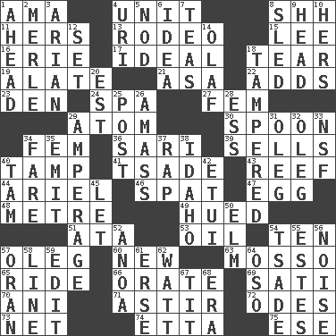ACROSS 1. Wet nurse (var.) 4. A single undivided whole 8. Quiet! 11. Possessive pronoun 13. Cowboy competition 15. Area sheltered from the wind 16. One of the Great Lakes 17. Perfect 18. Pull into pieces 19. Having winglike extensions 21. White ___ sheet 22. Sums up 23. Lair 24. Health resort 27. Opposite of masc. 29. Smallest unit of an element 30. Soup utensil 34. Opposite of masc. 36. Indian skirt 39. Exchanges for money 40. Pack (down) 41. Sadhe (variant) 43. Coral collection 44. Satellite of Uranus 46. Petty quarrel 47. Oval reproductive body of a fowl 48. Distance measurement (Brit.) 49. Took on color 51. _ moment's notice (2 wds.) 53. Petroleum 54. Nine, plus one 57. Cassini of fashion 60. ___ Haven, CT 63. With motion or animation 65. Travel on an animal 66. Declaim 69. Suttee (variant) 70. Black tropical American cuckoo 71. Moving or stirring 72. Lyric poems 73. Fish or hair follower 74. Singer James 75. Compass dir. DOWN 1. Forward in time 2. Haggard of country music 3. Believer in; advocate of (suffix) 4. RI univ. 5. Allow head to fall sleepily 6. It may be bright or harebrained 7. Beverages made from leaves 8. Downhill vehicle 9. Froth on beer 10. Possessive pronoun 12. Arrange properly for use 14. Norwegian king 18. ________ with (broke a safety seal) 20. Eastern Standard Time (abbr.) 25. Mail 26. Collect or gather 28. Double-curved letter 29. Electrical Measurement 31. Cassini of fashion 32. Cassini of fashion 33. Overdraft (abbr.) 34. Conductor's collection 35. Give off 37. Hit sharply and swiftly 38. Potato state 40. Scottish cap 42. Needle holder 45. Allow 50. Shade tree 52. Small Philippine buffalo 54. Sadhe (variant) 55. _____ Park, CO 56. Annoying sound 57. Northwest Algerian city 58. Actor's bit 59. Prepare for publication 61. Celtic language 62. Electrical Unit 64. Bear (Spanish) 67. Teat (slang) 68. Period