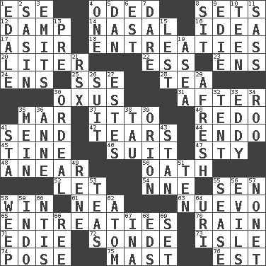 ACROSS 1. Compass dir. 4. Wrote a lyric poem 8. Puts into a specified state 12. Moist 14. Rhinal 16. It may be bright or harebrained 17. SW Saudi Arabia district 18. Pleas 20. 61 cubic inches 22. Double-curved letter 23. Followers of ems 24. Followers of ems 25. Compass dir. 28. Afternoon social gathering 30. The longest river in Central Asia 31. Following 35. Make imperfect 37. "Tell ____ the Marines!" 40. Make new 41. Post 42. Separates forcefully 44. Inside; within (prefix) 45. Prong on a fork 46. Set of matching outer garments 47. Filthy place 48. Approach 50. Pledge 52. Allow 54. Compass dir. 55. Elected rep. 58. Acquire through effort 61. Teachers' org. 63. New (sp.) 65. Pleas 70. Precipitation 71. Singer Brickell 72. Message 73. Small island 74. Airs 75. Vertical spar for supporting sails 76. Eastern Standard Time (abbr.) DOWN 1. Peak District village in England 2. Indian antelope 3. Sends forth 4. Single 5. Daniel's nick name 6. Eastern Standard Time (abbr.) 7. Have the gumption 8. Be seated 9. Singer Brickell 10. Adolescent 11. Backtalk 13. Before (prefix) 15. For fear that 19. Toward the sea 21. Acura sports coupe 26. Costume for a special activity 27. _____ Park, CO 29. Anew 30. Severe or trying experience 32. Portable shelter 33. Whirlpool 34. Friend of Pooh 35. Chow _ 36. Singer Murray 38. The 19th letter of the Greek alphabet 39. Greek mythologigal hunter 41. R.R. building 43. Comedian Laurel of Laurel & Hardy 49. French philosopher Descartes 51. Nine, plus one 53. Beverages made from leaves 55. Gospel singer Marvin 56. Vices 57. Music written for nine 58. Shed a tear 59. _ china 60. Nuclear Threat Initiatives 62. Smallest unit of an element 64. RI univ. 66. Portuguese money of account (variant) 67. _ tizzy (2 wds.) 68. Begley and Asner 69. Arrange properly for use