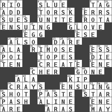 ACROSS 1. _ de Janeiro 4. Change direction abruptly 8. Label 11. Say or write further 12. Cod relative 14. Blunders 15. Takes to court 17. Join together 18. Round or rotation of duties 19. Taking place subsequently 21. Michael Jackson trademark 23. Ovum 24. Compass dir. 25. In addition 27. Have the gumption 30. Wing 31. Full of chinks, cracks, or crevices 34. Double-curved letter 37. Luau course 38. Drinks excessively 39. Pass on 40. Nine, plus one 41. Cause to be 43. Compass dir. 44. "Mermaids" star 45. Went 47. Insect wing 49. Sleep 50. Trading vessels 52. Taking place subsequently 56. Guess 57. Thick mixture 60. Play the lead 61. Romantic infatuation 62. Place in a line 63. Compass dir. 64. "We ___ not amused" (Victoria) 65. Ancient river in northeast Turkey 66. Fifth month DOWN 1. Raze (variant) 2. Goddess of spring and wife of Bragi 3. Lyric poems 4. Feeling sharp psychological pain 5. Yearn 6. RI univ. 7. Eastern Standard Time (abbr.) 8. Collection of objects 9. Johnson of "Laugh-In" 10. Girls' org. (abbr.) 13. Cask 14. Greek god of love 16. Institutes legal proceedings 20. Composer Stravinsky 22. Area sheltered from the wind 25. Medicinal plant 26. (Had) reclined 27. Drug addict 28. Toward the sea 29. Remainder 30. Fitting 32. Hankering 33. Greater amount 34. Paradise 35. Trig term 36. Observe 42. Armor plate that protects the chest 44. Island 46. Musical composition 47. Came up 48. Thin strip of wood or metal 49. Leg joints 50. Burn to charcoal 51. Health resort 52. Inactive volcano in Sicily 53. Detail 54. Grandmother 55. Jennifer or Joel 56. Health resort 58. Wing 59. Title for a knight