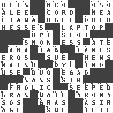 ACROSS 1. Wagers 5. Non-commissioned officer (abbr.) 8. Bear (Spanish) 11. Toward shelter 12. Drawstring 14. Teachers' org. 15. Woody, climbing, usually tropical plant 17. Double curve, resembling the letter S 18. Baltic tributary 19. Makes clutter 21. Portable computer 23. Elect 25. Position in a hierarchy or organization 26. Overwhelm 27. Curvy letter 28. Had dinner 31. Santa ___, CA 33. Bar bill 35. Corrects by punishment or discipline 37. Greek god of love 38. Institute legal proceedings 40. Not women's 41. Taiwanese island in East China Sea 43. Color 45. Working for oneself (abbr.) 46. Purpose 47. Superhero pair 50. Mild oath 52. Backtalk 53. Title for a knight 54. Romp 56. Oozed 61. Pate de foie ____ 62. Nathan's nickname 65. Scent 66. Mayday 67. Pate de foie ____ 68. SW Saudi Arabia district 69. Mature 70. Take to court 71. Wig DOWN 1. Lip ointment 2. Writer Wiesel 3. Afternoon social gatherings 4. Elected reps. 5. Non-commissioned officer (abbr.) 6. Gear tooth 7. Threatening words 8. Southwest Nigerian state 9. Ooze 10. Rowing implement 13. Allots cards 16. A really long time 18. Baseball player Mel 20. Specific locale 22. Mail 24. It was, poetically 26. Backtalk 28. So be it 29. Watch over 30. Double-curved letter 31. Ancient river in northeast Turkey 32. Brief written record 34. Partially opened flower 36. Among 37. Australian flightless bird 39. Snake ____ (dice throw) 42. Allodial 44. Armor plate that protects the chest 48. Exploiting 49. Motion picture awards 51. Length times width 52. Mayday 54. Tree-dwelling hopper 55. To erase 57. Part of Q.E.F. 58. Airs 59. Send forth 60. Have the gumption 61. Girls' org. (abbr.) 63. The 19th letter of the Greek alphabet 64. Compass dir.