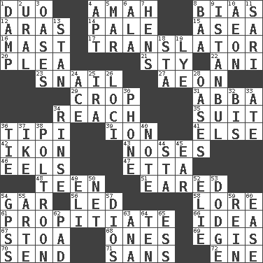ACROSS 1. Superhero pair 4. Wet nurse 8. Prejudice 12. Caspian sea tributary 14. Diluted with white 15. At sea 16. Vertical spar for supporting sails 17. Interpreter 20. Entreaty 21. Filthy place 22. Cuckoo 23. Slow-paced one 27. A really long time 29. Riding implement 31. Swedish rock group 34. Arrive at 35. Costume for a special activity 36. Native american tent (variation) 39. Electrically charged atom 41. Otherwise 42. Image 43. Olfactory organs 46. Snakelike fish 47. Singer James 48. Adolescent 51. Having ears or earlike features 54. Slender fish 56. Directed 58. Old wives' tales, e.g. 61. Appease 66. The content of cognition 67. Portico 68. Singles 69. The front part of a cuirass 70. Post 71. Without 72. Compass dir. DOWN 1. Moist 2. Mountain range 3. Fertile tracts in a desert 4. Fitting 5. Make imperfect 6. Chicken ___ king 7. Coop moms 8. Sound made by sheep 9. Byzantium, centuries later 10. Period of immesurable duration 11. Indian skirt 13. Comedian Laurel of Laurel & Hardy 18. R.R. building 19. Sodium hydroxide 24. Adept person 25. Retirement account (abbr.) 26. Venues 28. Fertile tracts in a desert 30. Give a jingle 32. Altar cloth linen 33. Had dinner 34. Wash lightly 36. Make a knot 37. Eisenhower's nickname 38. Characterized by complete cowardliness 40. Observe 44. R.R. building 45. Hearing organ 49. Biblical high priest 50. Fish or hair follower 52. Writer Wiesel 53. Evade 54. Global Positioning Systems (abbr.) 55. Johnson of "Laugh-In" 57. "Vaya con ____" 59. It's straight from the horse's mouth 60. Relaxation 62. Writing tablet 63. Santa ___, CA 64. "___ Little Indians" 65. Double-curved letter