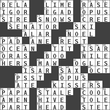 ACROSS 1. Actor Lugosi 5. Welles in "The Third Man" 9. Raze (variant) 13. Composer Stravinsky 14. Mild oath 15. Musical composition 16. Male parent of an animal 17. Overwhelms 18. Algonquian 19. Elected representative 21. What Jean-Claude Killy likes to do 22. Having or resembling wings 23. Christmas carol 24. Writing tablet 27. A saturated hydrocarbon 28. Respite 29. Sea 31. Teat (slang) 32. Astrian river, tributary to the Danube 36. Mouths or openings 37. Surprise greeting 38. The longest river in the world 39. Possessive pronoun 40. Informal term for the mouth 41. Stares 42. Astrian river, tributary to the Danube 44. Saxophone 46. Sep. follower 47. Inconspicuous attention getter 48. Musical composition 50. Had dinner 51. Smoochers 54. Dad 56. Having lost freshness 58. Calm and collected 60. So be it 61. Hub of activity 62. Lacquered or enameled metalware 63. Piece 64. Froth on beer 65. Proofreading order DOWN 1. Twice 2. The front part of a cuirass 3. Old wives' tales, e.g. 4. Sports stadium 5. Poe poem 6. Russian composer Stravinsky 7. Informal term for the mouth 8. Begley and Asner 9. Shooting up abruptly 10. Showery time 11. Take to court 12. Compass dir. 17. Comedian Laurel of Laurel & Hardy 20. ____ Jay Lerner 21. Mayday 23. Fish or hair follower 24. "Silly old bear" 25. Land measure 26. Letter starter 28. _ de Janeiro 30. Helper 31. Pull behind 33. Grain storage tower 34. Actor Baldwin 35. Take ten 37. Long, evenly shaped piece 40. Floor covering 41. The longest river in Central Asia 43. Compass dir. 44. Dirtied 45. Domed church section 47. Some stationery 49. Religious groups 51. Polynesian shrub of the pepper family 52. Carrot, for example 53. Not divided or shared with others 54. Infant food 55. Wet nurse (var.) 56. Quiet! 57. Neckwear 59. Allow