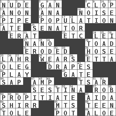 ACROSS 1. Unadorned 5. Separate the seeds from cotton 8. Hoof sound 12. Soon (poet.) 13. Santa ___, CA 14. Annoying sound 15. Corncob 16. Census information 19. Had dinner 20. Legislator 21. Part of Q.E.F. 23. And so on (abbr.) 24. Flowery wreath 27. Billionth: prefix 30. Frog relative 31. Eaten away 34. Flexible conduit 35. Cowardly lion portrayer 38. Puts on (as clothing) 40. Singer James 41. Cassini of fashion 42. Window treatments 44. Romp 45. Yard entry 46. Plant excrement 47. Electrical Unit 50. Russian ruler of old 53. French poetic form 57. Director Reiner 59. Conciliate 63. Opera by Verdi 64. Bake eggs in their shells 65. Mountains (abbr.) 66. Adolescent 67. Lacquered or enameled metalware 68. Cooking vessel 69. _ vera DOWN 1. California wine valley 2. Join together 3. Drug addict 4. Compass dir. 5. Stare wonderingly 6. At once, immediately (arch.) 7. California wine valley 8. Small bed 9. Cards in a Roman deck? 10. Bear (Spanish) 11. Animal enclosure 14. Drug cop 17. Shoshoni 18. Car dealer's back yard 20. Play the lead 22. Disorder of the immune system 24. Spoils 25. 90 degrees 26. The main thing one is thinking about 28. At this time 29. Wrote a lyric poem 30. College papers 32. Ewer handle 33. To be drawn or hauled along 35. Chops off 36. Silent film actress Nazimova 37. Pile 39. Health resort 43. Singer James 47. SW Saudi Arabia district 48. Was introduced to 49. Air pressure measure (abbr.) 51. Satellite of Uranus 52. Cowboy competition 54. Pack (down) 55. "Tell ____ the Marines!" 56. A home for chicks 58. Object of repulsion 59. Pacific Standard Time (abbr.) 60. 17th letter of the Greek alphabet 61. Lubricate 62. Before (prefix) 63. "One Day ___ Time"