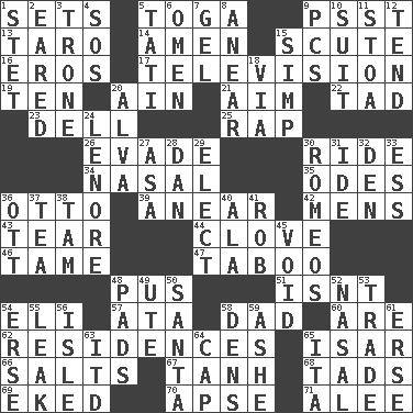 ACROSS 1. Arranges properly for use 5. Ancient Roman robe 9. Inconspicuous attention getter 13. Edible starchy tuberous root 14. So be it 15. Turtle shell scale 16. Greek god of love 17. Household entertainment appliance 19. "___ Little Indians" 20. The 18th letter of the Arabic alphabet 21. Direct toward a target or goal 22. Small amount or degree 23. Small valley 25. Hit sharply and swiftly 26. Elude 30. Travel on an animal 34. Rhinal 35. Lyric poems 36. Von Bismarck 39. Approach 42. Not women's 43. Pull into pieces 44. Garlic unit 46. Not wild 47. Off limits 48. Festering 51. Is not 54. Connecticut Ivy Leaguer 57. "One Day ___ Time" 58. June honoree 60. "We ___ not amused" (Victoria) 62. Dwellings 65. Astrian river, tributary to the Danube 66. Table seasonings 67. Hyperbolic tangent 68. Bits 69. Supplemented with great effort 70. Domed church section 71. Toward shelter DOWN 1. Proofreading order 2. Having ears or earlike features 3. Marketplace scale 4. Mayday 5. Jacques of French films 6. Sign of things to come 7. Set 8. Approach 9. Personal Computers (abbr.) 10. Set of matching outer garments 11. Portico 12. Look after 15. Simple or foolish person 18. By way of 20. Inventor's middle name 24. Poe poem 27. White ___ sheet 28. One of the 12 tribes of Israel 29. Opt 30. Lover boys 31. Binary compound 32. Lair 33. Curvy letter 36. Baseball player Mel 37. Afternoon social gathering 38. Scottish cap 40. In the manner of 41. Director Reiner 45. Null 48. Writing tablets 49. Shoshoni 50. Before Barbara or Clara 52. Rhinal 53. Exchange 54. Celtic language 55. Path through which fluid escapes 56. Small island 58. Lairs 59. American tennis player Robert 61. Celtic language 63. It would 64. Head covering 65. Call ___ day