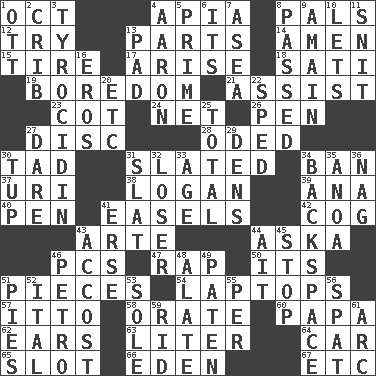 ACROSS 1. Sep. follower 4. Capital of Western Samoa 8. Friends 12. Attempt 13. Actors' quests 14. So be it 15. Hoop that covers a wheel 17. Ascend 18. Suttee (variant) 19. Mood resulting from idleness 21. Help 23. Small bed 24. Fish or hair follower 26. Animal enclosure 27. Flat circle 28. Wrote a lyric poem 30. Small boy 31. Scheduled 34. Forbid 37. RI univ. 38. Utah city north of Ogden 39. Santa ___, CA 40. Fenced enclosure 41. Artist's stands 42. Gear tooth 43. Johnson of "Laugh-In" 44. "____ silly question..." 46. Personal Computers (abbr.) 47. Strike 50. It is 51. Components 54. Portable computers 57. "Tell ____ the Marines!" 58. Speak pompously 60. Dad 62. Hearing organs 63. 61 cubic inches 64. Automobile 65. Narrow opening 66. Genesis locale 67. And so on (abbr.) DOWN 1. Baseball player Mel 2. Baby bed with high sides 3. Polypeptide antibiotic 4. Composer Copland 5. A-one 6. It is 7. At sea 8. Went by 9. With great haste 10. Allows 11. In a ____ (agitated or irritated) 13. Groovy apt. 16. Greek god of love 20. And so on (abbr.) 22. Drove too fast 25. Add up to 27. Have the gumption 29. Hiding places for outlaws 30. Uncastrated adult male sheep 31. Narrow board 32. Failure 33. Grow older 34. Keyboard key 35. Small Philippine buffalo 36. Tired old horse 41. Celtic language 43. Buttonhole 44. Small island 45. Cease 46. Stone: prefix 48. Having winglike extensions 49. Eucharist need 51. Sliced desserts 52. Slanted text style (abbr.) 53. Not divided or shared with others 55. For each 56. Petty quarrel 59. To free from 61. Curve