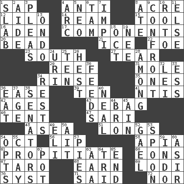 ACROSS 1. Plant excrement 4. Opposed to 8. Land measure 12. _ and Stitch 14. 480, 500 or 516 sheets of paper 15. Implement 16. Arabian gulf 17. Parts 20. Necklace unit 21. Frozen water 22. Enemy 23. Compass direction 27. Pull into pieces 29. Coral collection 31. Undercover agent 34. Wash lightly 35. Washington bills 36. Relaxation 39. Nine, plus one 41. Nuclear Threat Initiatives 42. Ripens 43. Debunk (Brit. slang) 46. Portable shelter 47. Indian skirt 48. Toward the sea 51. Yearns 54. Sep. follower 56. Mouth edge 58. Capital of Western Samoa 61. Appease 66. Immeasurably long periods of time 67. Edible starchy tuberous root 68. Merit 69. Farming town in central California 70. System (abbr.) 71. Expressed in words 72. And not DOWN 1. Broad, flat, thick piece 2. Helper 3. Entreaties 4. Curve 5. Modern: prefix 6. Scottish cap 7. Body of Kaffir warriors 8. Had dinner 9. Meet 10. Printing process, for short 11. Otherwise 13. Southwest Nigerian state 18. Sep. follower 19. Born 24. RI univ. 25. Nine, plus one 26. Behest 28. Amid 30. Gives food to 32. Luau accessory 33. Curvy letter 34. Musical pauses 36. Erode 37. Personal question 38. Legislators 40. Anneal 44. Sis' sibling 45. The 18th letter of the Arabic alphabet 49. Biblical high priest 50. Small island 52. Highlander 53. Soup utensil 54. Chooses 55. Supercomputer manufacturer 57. Sliced desserts 59. _ china 60. SW Saudi Arabia district 62. Plant holder 63. Auto club (abbr.) 64. Three (prefix) 65. Conclusion