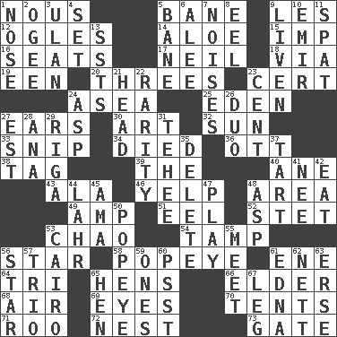 ACROSS 1. Common sense 5. Object of repulsion 9. French article 12. Stares 14. _ vera 15. Mischievous child 16. Theater features 17. Famous astronaut Armstrong 18. By way of 19. Car or cant ending 20. Triplets 23. Foregone conclusion 24. Toward the sea 25. Paradise 27. Hearing organs 30. Tate display 32. Player for Phoenix 33. Clip 34. Passed on 36. Baseball player Mel 38. Label 39. Definite Article 40. One (Scot) 43. Insect wing 46. Sharp bark 48. Length times width 49. Electrical Unit 51. Snakelike fish 52. Proofreading order 53. US Secretary of Labor Elaine L. _ 54. Pack (down) 56. Play the lead 58. Wimpy's pal 61. Compass dir. 64. Three (prefix) 65. Coop moms 66. A person who is older than you are 68. Wind 69. Snake ____ (dice throw) 70. Portable shelters 71. Friend of Pooh 72. A home for chicks 73. Yard entry DOWN 1. Sense of smell 2. Double curve, resembling the letter S 3. ____ Bator 4. Put into a specified state 5. Object of repulsion 6. Toward shelter 7. Annoying sounds 8. Snakelike fish 9. Make or become more lively 10. Arab leader 11. Argument over a trivial matter 13. Fast planes 21. Froth on beer 22. Noteworthy scarcity 23. Penny 24. Cleo's killer 26. Superhero pair 27. Eastern Standard Time (abbr.) 28. Santa ___, CA 29. Capital of Latvia 31. Giggle 35. Erase 37. Small pie 41. Born 42. Ingest 44. Cowardly lion portrayer 45. Nanny (var.) 47. Romp 48. Cleo's killer 50. Wimpy's pal 53. Capital of Egypt 55. Confront 56. Play the lead 57. Musical group of three 59. Washington bills 60. Inconspicuous attention getter 61. Pulitzer Prize-winning author Ferber 62. Remaining after all deductions 63. Celtic language 65. Layer 67. Part of a journey