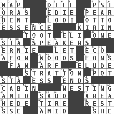 ACROSS 1. Atlas unit 4. Deli pickle 8. Pacific Standard Time (abbr.) 11. Mouths or openings 13. Singer Brickell 14. Lightbulb-shaped fruit 15. Gouge 16. Farming town in central California 17. "Beetle Bailey" pooch 18. Center 21. Japanese brewing company 22. A blast of a horn 23. Connecticut Ivy Leaguer 25. Single 26. R.R. building 29. Orators 32. Bert's buddy 34. Allow 35. Environmental prefix 38. Period of immesurable duration 39. Forest 41. Immeasurably long periods of time 43. Air blower 44. Sandy's bark 45. Dodge 46. Ski resort town in Vermont 50. Plant holder 51. R.R. building 54. Double-curved letter 55. Conclusions 57. Apartment or room in a ship 59. Snuggling 63. Among 64. Saudi Arabian king (1953-1964) 67. Type of rug 68. Ancient Persian 69. Hoop that covers a wheel 70. Take ten 71. Compass dir. 72. Among 73. A female animal or person DOWN 1. Method 2. Ancient Greek god of war 3. Baking dishes 4. Keyboard key 5. Wedding promise 6. Hat (slang) 7. Flowery wreath 8. Stone: prefix 9. Smooth fabric 10. Marketplace scale 12. Proofreading order 14. Luau course 19. Olfactory organ 20. Police officer (slang) 21. Apertif with cassis 23. Supplemented with great effort 24. Allows 26. Ocean 27. Not kosher 28. Small Philippine buffalo 30. Upward 31. Sew up the eyelids of hawks and falcons 33. Restaurants 36. Overturn; upset 37. Southwest Nigerian state 39. Armed conflicts 40. Mouths or openings 42. Put into a specified state 45. Extremities 47. "___ Little Indians" 48. Looked after 49. Single 51. Fraudulent business schemes 52. Softens 53. Remain 56. Play the lead 58. Binary compound 60. Angers 61. Delicate 62. Yard entry 64. R.R. building 65. Direct toward a target or goal 66. RI univ.