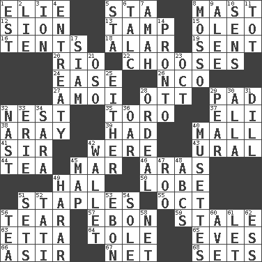ACROSS 1. Writer Wiesel 5. R.R. building 8. Vertical spar for supporting sails 12. The Jewish people; Israel 13. Pack (down) 15. Margarine 16. Portable shelters 18. Having or resembling wings 19. Posted 20. River (Sp.) 22. Elects 24. Comfort 26. Non-commissioned officer (abbr.) 27. Mine, in Marseilles 28. Baseball player Mel 29. Writing tablet 32. Egg locale 35. "Corrida" creature 37. Biblical high priest 38. Like ___ of sunshine 39. Possessed 40. Promenade 41. Title for a knight 42. Past tense of be (plural) 43. Mountain range 44. Afternoon social gathering 45. Spoil 46. Caspian sea tributary 49. Actor Linden 50. Ear part 51. Paper fasteners 55. Sep. follower 56. Rend 57. Inky black, to poets 59. Having lost freshness 63. Singer James 64. Lacquered or enameled metalware 65. Nights before holidays 66. SW Saudi Arabia district 67. Fish or hair follower 68. Puts into a specified state DOWN 1. Eastern Standard Time (abbr.) 2. Falsehood 3. Electrically charged atom 4. Plea 5. R.R. building 6. Baby powder 7. Nursemaid 8. With motion or animation 9. Toward shelter 10. Elected reps. 11. Small child 14. Right away 17. Thailand, formerly 21. Bear (Spanish) 23. Sep. follower 25. One or the other of two 28. Severe or trying experience 29. Lightbulb-shaped fruit 30. Silent film actress Nazimova 31. Deli pickle 32. Political cartoonist Thomas 33. 4th largest of the Great Lakes 34. "Two Mules for Sister ____" 36. Rowing implement 40. French bagpipes 42. Place for singles 45. Atlas unit 47. Friend of Pooh 48. Lettered men learn these first 49. Ethiopian city, capital of Harari 51. Arranges properly for use 52. Jacques of French films 53. Inky black, to poets 54. Not divided or shared with others 56. Afternoon social gathering 58. Fish or hair follower 60. "___ Maria" 61. Allow 62. Double-curved letter