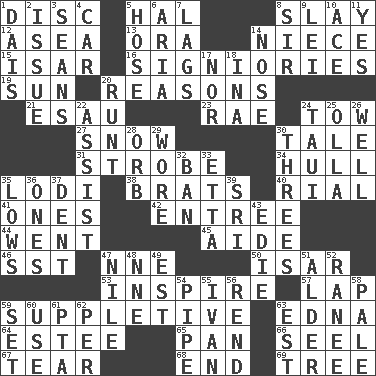 ACROSS 1. Compact _ 5. Actor Linden 8. Kill 12. Toward the sea 13. Mouth or opening 14. Sibling's daughter 15. Astrian river, tributary to the Danube 16. Seigniories (variant) 19. Player for Phoenix 20. Thinks logically 21. He sold his birthright 23. Actress Charlotte 24. Pull behind 27. Frozen precipitation 30. Falsehood 31. Disco prop 34. Frame or body of a ship 35. Farming town in central California 38. Naughty children 40. Monetary unit of Yemen 41. Singles 42. Main course 44. Left 45. Assistant 46. Fast jet (abbr.) 47. Compass dir. 50. Astrian river, tributary to the Danube 53. Stimulate to action 57. Pet locale 59. Supplementary 63. Pulitzer Prize-winning author Ferber 64. First name in cosmetics 65. Baking dish 66. Sew up the eyelids of hawks and falcons 67. Separate forcefully 68. Conclusion 69. Woody plant DOWN 1. Raised platform 2. Come out of 3. Actors Connery and Penn 4. Auto 5. Flexible conduit 6. Operatic vocal solo 7. Falls behind 8. Title for a knight 9. Luau accessory 10. Adept person 11. Affirmative reply 14. Sense of smell 17. And not 18. _ tizzy (2 wds.) 20. Undersized animal 22. Help 24. "Change" in Tahitian 25. Water jar 26. Water source 28. Globe 29. Had on 30. Trios 32. Forbid 33. Singer James 35. Coldest temperatures 36. Washington bills 37. Gouge 39. _ Lanka 43. Singer Brickell 47. The longest river in the world 48. Compass dir. 49. Eastern Standard Time (abbr.) 51. Tree or shrub in the Birch family 52. Indian princess (variant) 54. Corncob 55. _ the terrible 56. Tear apart 58. Diluted with white 59. Put into a specified state 60. Purpose 61. Parent Teacher Assoc. 62. For each 63. Eastern Standard Time (abbr.)