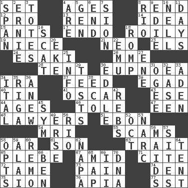ACROSS 1. Arrange properly for use 4. Ripens 8. Tear apart 12. Adept person 13. Painter Guido (1575-1642) 14. The content of cognition 15. Pismires 17. Inside; within (prefix) 18. Agitated, as a liquid 19. Sibling's daughter 21. Modern: prefix 23. Raised railways 24. 1973 Nobel Price Winner (Physics) Leo 26. Madame (abbr.) 28. Portable shelter 30. Normal relaxed breathing 34. Retirement account (abbr.) 37. Nourish 39. Mild oath 40. Metal container 41. Witty Wilde 43. Compass dir. 44. Ripens 46. Lacquered or enameled metalware 47. Car or cant ending 48. Those who practice law 51. Inky black, to poets 54. Medical imaging device (abbr.) 55. Fraudulent business schemes 58. Rowing implement 61. Boy, to dad 63. Distinguishing feature 65. Military trainee 67. Among 71. Quote 72. Docile 73. Ache 74. Lair 75. The Jewish people; Israel 76. Capital of Western Samoa 77. Fast jet (abbr.) DOWN 1. Connect, as a bridge 2. Bert's buddy 3. Hauls 4. "We ___ not amused" (Victoria) 5. Commissioned military rank (abbr.) 6. Conclusion 7. The Jewish people; Israel 8. _ de Janeiro 9. Singer Brickell 10. 1994 drama film starring Jodie Foster 11. 24-hour periods 16. Get outta here! 18. Play 20. Supplement with great effort 22. Australian flightless bird 25. Information 27. Compass dir. 29. Trials 30. Peak District village in England 31. Double curve, resembling the letter S 32. Relaxation 33. Arabian gulf 34. Slanted text style (abbr.) 35. Capital of Latvia 36. Afresh 38. Environmental prefix 42. Confederate soldiers (slang) 45. Symbol (abbr.) 49. Celtic language 50. River (Sp.) 52. Sep. follower 53. Drug cop 56. Women servants 57. Locates 58. Elects 59. Jai _ 60. San ____ (Riviera town) 62. California wine valley 64. Portable shelter 66. Benjamin's nick name 68. Atlas unit 69. One more than two 70. Heredity factor (abbr.)