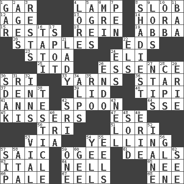 ACROSS 1. Slender fish 4. Desk light 8. Oscar Madison type 12. Personal question 13. Legendary monster 14. Israeli folk dance 15. Musical pauses 18. It's straight from the horse's mouth 19. Swedish rock group 20. Paper fasteners 22. Begley and Asner 23. Portico 24. Biblical high priest 25. It would 26. Substance 30. Indian title of respect (Mr.) 33. Tall tales 36. Play the lead 37. Incision 39. Hat (slang) 40. Native american tent (variation) 41. Queen of England 1702-14 42. Soup utensil 44. Compass dir. 45. Smoochers 47. Compass dir. 50. Three (prefix) 51. Australian parrot (variant) 53. By way of 54. Crying or shouting loudly 57. Ketch in the Levant 59. Double curve, resembling the letter S 61. Allots cards 63. Slanted text style (abbr.) 64. 1994 drama film starring Jodie Foster 65. Born 66. Diluted with white 67. Snakelike fish 68. Compass dir. DOWN 1. Slender fish 2. Ripens 3. Musical pauses 4. Old wives' tales, e.g. 5. Ripens 6. Medical imaging device (abbr.) 7. Animal enclosure 8. Most dubious of character or honesty 9. Tennis shots 10. Globe 11. Sound made by sheep 16. Jacques of French films 17. Specific locale 21. Kenny Rogers chart-topper in '80 22. Raised railways 24. Double-curved letter 26. Inside; within (prefix) 27. Nuclear Threat Initiatives 28. Balmoral and tarboosh 29. One of the Great Lakes 30. Neighbor of Neb. 31. Painter Guido (1575-1642) 32. Lodging establishments 34. High mountains 35. _ de Janeiro 38. A testis 42. Indian title of respect (Mr.) 43. 1994 drama film starring Jodie Foster 46. Period 48. Disposed of to a purchaser 49. One of the Great Lakes 52. Empty; void 53. Small bottle 54. Shout 55. Snakelike fish 56. Small, secluded valley 57. Small drink 58. "One Day ___ Time" 59. Single 60. Unit of force equal to gravity 62. Perceive with the eye