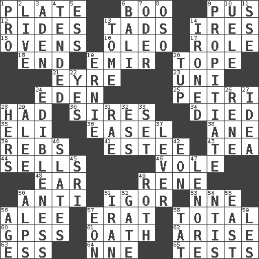 ACROSS 1. Food holder 6. Sometimes accompanies a hiss 9. Suppuration 12. Amusement-park features 13. Bits 14. Angers 15. Baking chambers 16. Butter sub 17. Hero or heavy, e.g. 18. Conclusion 19. Independent ruler or chieftain 20. Drink excessively 21. Jane of fiction 23. Corn or form start 24. Genesis locale 25. _ dish (used to culture cells) 28. Possessed 30. Titles for men of rank and authority 34. Passed on 35. Connecticut Ivy Leaguer 36. Artist's stand 38. One (Scot) 39. Confederate soldiers (slang) 41. First name in cosmetics 43. Afternoon social gathering 44. Makes a sale 46. Grand slam 48. Hearing organ 49. French philosopher Descartes 50. Opposed to 51. Composer Stravinsky 53. Compass dir. 56. Toward shelter 57. Part of Q.E.F. 58. "_____ Recall" 60. Global Positioning Systems (abbr.) 61. Pledge 62. Originate 63. Double-curved letter 64. Compass dir. 65. Trials DOWN 1. Adept person 2. Not recorded 3. Arabian gulf 4. Looked after 5. Curvy letter 6. Indonesian resort city 7. River in Europe 8. Bear (Spanish) 9. Appease 10. Ubangi River tributary 11. Compass dir. 13. Heavy book 14. Pressed 19. Bert's buddy 20. Uncastrated adult male sheep 22. Consenting reply 24. The property of being fit to eat 26. French philosopher Descartes 27. The main thing one is thinking about 28. Possessive pronoun 29. Toward shelter 31. Actress Charlotte 32. Double-curved letter 33. Put into a specified state 37. Crowbar 40. Chalkboards 42. Period of immesurable duration 45. _ Lanka 47. Poe poem 49. Writer of Portnoy's Complaint (1969) 50. High mountains 51. SW Asia republic 52. Yard entry 54. Nuclear Threat Initiatives 55. 90 degrees 56. Ripen 57. Period of immesurable duration 58. Make lace 59. French article
