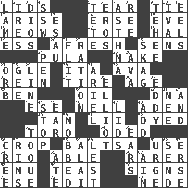 ACROSS 1. Hats (slang) 5. Rend 9. Neckwear 12. Originate 14. Celtic language 15. Night before a holiday 16. Catcalls? 17. Lug 18. Actor Linden 19. Curvy letter 20. Anew 23. Elected reps. 24. Monetary unit of Botswana 25. Create 27. Stare at amorously 30. Call ___ day 32. Actress Gardner 33. It's straight from the horse's mouth 34. Hoop that covers a wheel 36. Mature 38. Benjamin's nick name 39. Petroleum 40. Heredity factor (abbr.) 43. Compass dir. 46. 1994 drama film starring Jodie Foster 48. An important port of Yemen 49. Scottish cap 51. Cards in a Roman deck? 52. Colored 53. "Corrida" creature 54. Wrote a lyric poem 56. Riding implement 58. Greek mezzo-soprano Agnes 61. Purpose 64. _ de Janeiro 65. Competent 66. More valued for its uncommonness 68. Australian flightless bird 69. Afternoon social gatherings 70. Public displays of written messages 71. Compass dir. 72. Prepare for publication 73. Ancient Persian DOWN 1. Unable to walk 2. Angers 3. "Vaya con ____" 4. Compass dir. 5. False hair 6. Greek god of love 7. Respiratory problem 8. To separate or throw off 9. Giggle 10. "Terrible" tsar 11. Snakelike fish 13. He sold his birthright 21. Secret move to avoid paying debts 22. Food allowance for one day 23. Heroin 24. Animal enclosure 26. Actress Gardner 27. Globe 28. Unit of force equal to gravity 29. Actor's bit 31. Satellite of Uranus 35. American author Paul (1891-1958) 37. Whirlpool 41. Born 42. Also 44. Discontinue 45. Ewer handle 47. Hats (slang) 48. Find the sum of 50. Crowded into 53. Woman's close-fitting hat 55. Hearing organs 56. Algonquian 57. Basketball hoops 59. Jai _ 60. For fear that 61. Goad 62. Post 63. Celtic language 65. Had dinner 67. Direct toward a target or goal