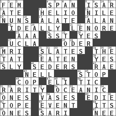 ACROSS 1. Opposite of masc. 4. Connect, as a bridge 8. Astrian river, tributary to the Danube 12. Had dinner 13. Sun: prefix 14. "Death on the ____" 15. Religious women 17. Having winglike extensions 18. ____ Jay Lerner 19. Under perfect conditions 21. Poe poem 23. Auto club (abbr.) 24. Fast jet (abbr.) 26. Affirmative reply 27. Southern CA. univ. 28. River in Europe 30. Medical imaging device (abbr.) 31. Chalkboards 34. Definite Article 37. Make lace 38. Ingested 39. Consenting reply 40. Secret 41. Spring feasts 42. Actress Charlotte 43. 1994 drama film starring Jodie Foster 44. Obstruct or block passage 46. Police officer (slang) 47. Connecticut Ivy Leaguer 50. Nervous spasm 51. Noteworthy scarcity 54. Pertaining to the sea 57. Washington bills 58. Flower holders 60. Singer Brickell 62. Drink excessively 63. Happening 64. It is 65. Singles 66. Indian skirt 67. Born DOWN 1. Avid follower 2. Needle holder 3. Ananias' fault 4. Makes a sale 5. Live dramatic performances 6. Small island 7. Christmas carol 8. More empty; more void 9. Grain storage towers 10. Having or resembling wings 11. French philosopher Descartes 13. Actor Linden 16. Lick closed 20. American Automobile Association (abbr.) 22. Sight organs 25. Carrier 27. Mountain range 29. Cub Scout units 30. Mountains (abbr.) 31. Sew up the eyelids of hawks and falcons 32. Dipping utensil 33. Had dinner 34. Polypeptide antibiotic 35. Pile 36. Compass dir. 41. Back-to-school mo. 43. Annoying sounds 44. R.R. building 45. Prong on a fork 46. Streamer paper 48. Failure 49. Ancient Celtic tribe of eastern Britain 51. Printing process, for short 52. Soon (poet.) 53. Jacques Cousteau's middle name 55. Eastern Standard Time (abbr.) 56. Quote 59. Actress Gardner 61. Compass dir.