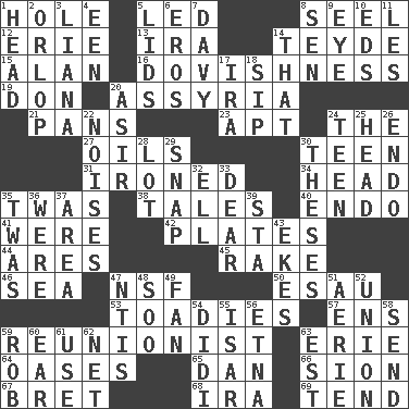 ACROSS 1. Hollow 5. Directed 8. Stitch closed the eyes of (a falcon) 12. 4th largest of the Great Lakes 13. Lyricist Gershwin 14. Miss Universe 1986, Barbara Palacios _ 15. ____ Jay Lerner 16. Innocence, gentleness, or tenderness 19. Spanish title 20. Nineveh was its capital 21. Baking dishes 23. Fitting 24. Definite Article 27. Lubricates 30. Adolescent 31. Pressed 34. Froth on beer 35. It was, poetically 38. Stories 40. Inside; within (prefix) 41. Past tense of be (plural) 42. Food holders 44. Ancient Greek god of war 45. Immoral or dissolute person 46. Ocean 47. Overdraft (abbr.) 50. Son of Isaac 53. Sycophants 57. Followers of ems 59. One who advocates reunion 63. 4th largest of the Great Lakes 64. Fertile tracts in a desert 65. One of the 12 tribes of Israel 66. The Jewish people; Israel 67. Cy Young winner Saberhagen 68. Lyricist Gershwin 69. Be inclined (to) DOWN 1. Froth on beer 2. Lowest deck of a ship 3. Climbing, woody, usually tropical vines 4. Car or cant ending 5. Hats (slang) 6. Greek god of love 7. _ Jones??? Locker 8. Elected rep. 9. Sight organ 10. Begley and Asner 11. French article 14. Not this but _ 17. Retirement account (abbr.) 18. Small drink 20. SW Saudi Arabia district 22. Annoying sounds 24. Adolescent 25. Froth on beer 26. Inside; within (prefix) 28. Car dealer's back yard 29. Fastener 30. College papers 32. Pipe bend 33. Letter starter 35. It was, poetically 36. Past tense of be (plural) 37. Length times width 39. R.R. building 43. Makes supply last 47. Nuclear Threat Initiatives 48. "Barney Miller" actor Jack 49. Air blower 51. Nest on high 52. The state of being joined or united 54. "You Light Up My Life" star Conn 55. Astrian river, tributary to the Danube 56. Inactive volcano in Sicily 58. Post 59. Director Reiner 60. Ewer handle 61. Purpose 62. Fish or hair follower 63. Eastern Standard Time (abbr.)