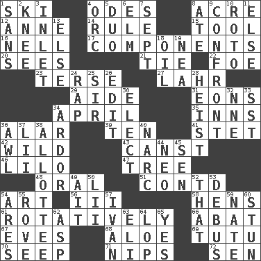 ACROSS 1. What Jean-Claude Killy likes to do 4. Lyric poems 8. Measure of real estate 12. Queen of England 1702-14 14. General guideline 15. Implement 16. 1994 drama film starring Jodie Foster 17. Parts 20. Perceives with the eye 21. Make a knot 22. Enemy 23. Laconic 27. Cowardly lion portrayer 29. Helper 31. Immeasurably long periods of time 34. Showery time 35. Restaurants 36. Having or resembling wings 39. Nine, plus one 41. Proofreading order 42. Uncontrolled 43. 2nd pers. sing. pres. of can (arch.) 46. _ and Stitch 47. Relationship diagram 48. Taken by mouth 51. Continued (abbr.) 54. Tate display 56. One more than two 58. Coop moms 61. Happening in regular succession 66. Blind as ____ 67. Nights before holidays 68. _ vera 69. Ballerina skirt 70. Ooze 71. Cuts off 72. Elected rep. DOWN 1. Without 2. Leg joint 3. An arm off of a larger body of water 4. The grampus (Milton) 5. Superhero pair 6. Shade tree 7. Back-to-school mo. 8. Had dinner 9. Meet 10. Printing process, for short 11. Otherwise 13. Otherwise 18. Petroleum 19. Teachers' org. 24. Reproach for some lapse or misdeed 25. Title for a knight 26. Prepare for publication 28. Robbery 30. Voters do this 32. Compass dir. 33. Fast jet (abbr.) 34. Zeal 36. Leather borer 37. Cards in a Roman deck? 38. One to whom something is allotted 40. Drug cop 44. Modern: prefix 45. Elected rep. 49. Small island 50. Cards in a Roman deck? 52. Not this but _ 53. To get out of a bus 54. Ancient Greek god of war 55. Be footloose 57. _ the terrible 59. Nathan's nickname 60. Surprise greatly 62. Viper 63. Connecticut Ivy Leaguer 64. Chop off 65. Affirmative reply