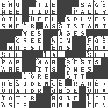 ACROSS 1. Australian flightless bird 4. Make a knot 7. Settles 11. To riddle 12. Event that recurs at intervals 13. Friendly 14. Lubricate 15. The bottom of a shoe or boot 16. Finds the solution 17. Scornful expression 19. Helper 21. Affirmative reply 23. Matures 24. Algonquian 25. Acquire through effort 26. Enemy 29. Obtain by seizing forcibly or violently 30. Followers of ems 31. Santa ___, CA 32. Observe 33. Ingest 34. Put into a specified state 35. Infant food 36. Armed conflict 37. Musical pauses 40. "We ___ not amused" (Victoria) 41. ___ a Wonderful Life 42. Singles 43. Old wives' tales, e.g. 45. Baseball player Mel 46. Home 51. More uncommon 55. Speaker 56. Mitch Miller's instrument 58. Mouth or opening 59. Carrier 60. Loose flowing garment 61. Cards in a Roman deck? 62. SW Saudi Arabia district 63. Heredity factor (abbr.) 64. Car or cant ending DOWN 1. Greek god of love 2. Count _ (2 wds.) 3. Ubangi River tributary 4. Make a knot 5. The content of cognition 6. Snakelike fish 7. Table seasonings 8. Inventor's middle name 9. Small, secluded valley 10. System (abbr.) 12. Trios 13. Airs 16. Public displays of written messages 18. Jane of fiction 20. Virtuous person 22. Arrange properly for use 24. Streamer paper 25. Erodes 26. Goes without food and/or water 27. Washington bills 28. Ingest 29. Erode 32. Health resort 33. Ingested 36. One who wires 37. Friend of Pooh 38. Main course 39. Bristle 43. 61 cubic inches 44. Aroma 46. Round or rotation of duties 47. Greek god of love 48. Suttee (variant) 49. Drawstring 50. Inky black, to poets 52. Hero or heavy, e.g. 53. 4th largest of the Great Lakes 54. Precipitation 57. Chief or king in Benin or Nigeria