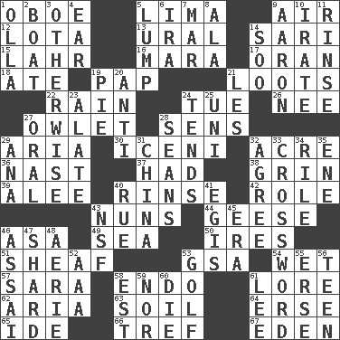 ACROSS 1. Mitch Miller's instrument 5. Pale green bean 9. Atmosphere 12. Globular water bottle used in Asia 13. Mountain range 14. Indian skirt 15. Cowardly lion portrayer 16. Hindu Mythology: god of death 17. NW Algerian seaport 18. Had dinner 19. Infant food 21. Plunders 22. Water falling in drops from the sky 24. Third day of the wk. 26. Born 27. A small or young owl 28. Elected reps. 29. Operatic vocal solo 30. Ancient Celtic tribe of eastern Britain 32. Land measure 36. Political cartoonist Thomas 37. Possessed 38. Amused look 39. Toward shelter 40. Wash lightly 42. Hero or heavy, e.g. 43. Religious women 44. Honkers 46. White ___ sheet 49. Ocean 50. Angers 51. To gather and bind into a bundle 53. Girls' org. (abbr.) 54. Soggy 57. "Two Mules for Sister ____" 58. Inside; within (prefix) 61. Old wives' tales, e.g. 62. Roberta Peters solo 63. The visible part of the earth's surface 64. Celtic language 65. Binary compound 66. Not kosher 67. Paradise DOWN 1. Rounded earthenware pot or jar 2. Water vessel 3. Else 4. Ewer handle 5. Mass 6. Lyricist Gershwin 7. Spoil 8. Wing 9. Composer Copland 10. Feeling or showing extreme anger 11. Wash lightly 14. "Barney Miller" actor Jack 19. Sliced dessert 20. Opposed to 21. French article 23. Having winglike extensions 24. Watches over 25. University (slang) 27. Of the mouth 28. Actors Connery and Penn 29. Santa ___, CA 31. Large country 32. Match 33. What you're doing now 34. Cause heat under the collar 35. Compass dir. 40. Sorrow 41. Armor plate that protects the chest 43. Science/research agcy. 45. Period 46. Slender Brazilian palm 47. Pottery fragment 48. Nest on high 52. American Automobile Association (abbr.) 53. _ course 55. Celtic language 56. Adolescent 58. Eastern Standard Time (abbr.) 59. And not 60. Expire 61. Area sheltered from the wind