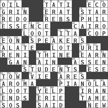 ACROSS 1. Lubricate 4. Jacques of French films 8. Environmental prefix 11. Amused look 13. Part of Q.E.F. 14. Play the lead 15. Make new 16. Confederate soldiers (slang) 17. Silvers or Donahue 18. Gist 21. Capital of Egypt 22. Spoils 23. Call ___ day 25. Police officer (slang) 26. A really long time 29. Orators 32. Having winglike extensions 34. Car dealer's back yard 35. RI univ. 38. Painter Guido (1575-1642) 39. One or ones belonging to thee 41. Merit 43. Separate the seeds from cotton 44. The 18th letter of the Arabic alphabet 45. NE Netherlands city 46. SAT takers 50. Compass dir. 51. Pull behind 54. Compete 55. Ancient Greek god of war 57. Odor 59. Player piano 63. Spoils 64. Sharp bark 67. SW Asia republic 68. Conclusions 69. 4th largest of the Great Lakes 70. Not wild 71. Mayday 72. Stated 73. ___ Haven, CT DOWN 1. Legendary monster 2. Angers 3. Hats (slang) 4. Cigar-shaped 5. "We ___ not amused" (Victoria) 6. Keyboard key 7. It is 8. Principle of right and wrong 9. Capital of Egypt 10. Lowest deck of a ship 12. Christmas carol 14. Health resort 19. Olfactory organ 20. Police officer (slang) 21. 4-wheeled motor vehicle 23. Image 24. False hair 26. Hearing organ 27. Cassini of fashion 28. Grandmother 30. Place in a line 31. Institutes legal proceedings 33. Canisters 36. To erase 37. Angers 39. "Change" in Tahitian 40. Flintstone garb 42. Compass dir. 45. At sea 47. Federal power corp. 48. Slept 49. Three (prefix) 51. Falsehoods 52. U. of Maine site 53. Forest 56. In a ____ (agitated or irritated) 58. Mountains (abbr.) 60. Northwest Algerian city 61. Unable to walk 62. Afresh 64. Consenting reply 65. Period 66. Cards in a Roman deck?