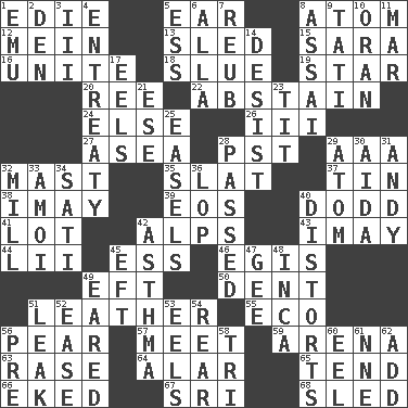 ACROSS 1. Singer Brickell 5. Hearing organ 8. Smallest unit of an element 12. Chow _ 13. Downhill vehicle 15. "Two Mules for Sister ____" 16. Join together 18. Turn sharply 19. Play the lead 20. To riddle 22. Refrain by choice 24. Otherwise 26. One more than two 27. At sea 28. Pacific Standard Time (abbr.) 29. American Automobile Association (abbr.) 32. Vertical spar for supporting sails 35. Narrow board 37. Shallow baking pan 38. "If ____ say so..." 39. Greek goddess of the dawn 40. Texas town _ City 41. Car dealer's back yard 42. High mountains 43. "If ____ say so..." 44. Cards in a Roman deck? 45. Curvy letter 46. The front part of a cuirass 49. Bank Draft (abbr.) 50. Scratch 51. Cordwainer's material 55. Environmental prefix 56. Lightbulb-shaped fruit 57. Rendezvous 59. Sports stadium 63. To erase 64. Having or resembling wings 65. Look after 66. Supplemented with great effort 67. Indian title of respect (Mr.) 68. Downhill vehicle DOWN 1. Australian flightless bird 2. Lair 3. One more than two 4. Plea 5. Curvy letter 6. Silent film actress Nazimova 7. Reuben's nickname 8. Slender Brazilian palm 9. Jacques of French films 10. Northwest Algerian city 11. Spoil 14. Stop 17. Snakelike fish 21. Compass dir. 23. Teat (slang) 25. Artist's stands 28. Went by 29. Tiny particle 30. Opera by Verdi 31. Actor Griffith 32. Place where flour is made 33. Mine, in Marseilles 34. Suttee (variant) 36. Trim (branches) 40. What propaganda does 42. Respiratory problem 45. Lizard (obsolete) 47. Turn to the right 48. South American Indian 49. Having ears or earlike features 51. Path through which fluid escapes 52. Comfort 53. Snakelike fish 54. Stern 56. Before (prefix) 58. Three (prefix) 60. Snakelike fish 61. Compass dir. 62. Find the sum of