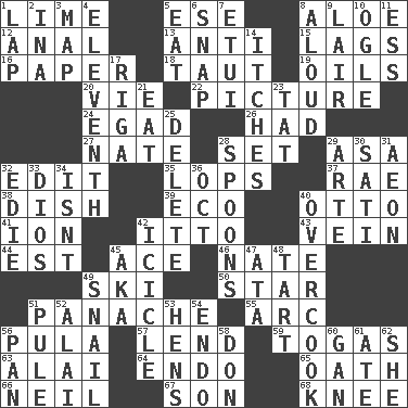 ACROSS 1. Welles in "The Third Man" 5. Compass dir. 8. _ vera 12. Of or related to the anus 13. Against 15. Falls behind 16. Some stationery 18. Drawn tight 19. Lubricates 20. Compete 22. Photo 24. Mild oath 26. Possessed 27. Nathan's nickname 28. Arrange properly for use 29. White ___ sheet 32. Prepare for publication 35. Chops off 37. Actress Charlotte 38. Food container 39. Environmental prefix 40. Von Bismarck 41. Electrically charged atom 42. "Tell ____ the Marines!" 43. Distinctive style or manner 44. Eastern Standard Time (abbr.) 45. Adept person 46. Nathan's nickname 49. What Jean-Claude Killy likes to do 50. Play the lead 51. Flamboyance 55. Curve 56. Monetary unit of Botswana 57. Grant temporary use of 59. Ancient Roman robes 63. Jai _ 64. Inside; within (prefix) 65. Pledge 66. Famous astronaut Armstrong 67. Male child 68. Leg joint DOWN 1. Pet locale 2. _ tizzy (2 wds.) 3. Atlas unit 4. Veterans Day date 5. Ingest 6. Fastener 7. Needle case 8. Verbally 9. Den 10. Stare 11. Double-curved letter 14. Irritating cutaneous sensations 17. Port city in Latvia 21. Ingest 23. Make lace 25. Keyboard key 28. Soup utensils 29. Johnson of "Laugh-In" 30. Suttee (variant) 31. Age 32. Singer Brickell 33. "Vaya con ____" 34. Is not 36. Sep. follower 40. Burn the roast 42. Tapering mass of hanging ice 45. Alias (abbr.) 47. "One Day ___ Time" 48. Small pie 49. Slow-paced one 51. Whine 52. Jai ____ 53. Coop moms 54. Inside; within (prefix) 56. Baking dish 58. Spanish title 60. Separate the seeds from cotton 61. Had dinner 62. A female animal or person