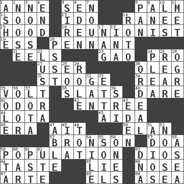 ACROSS 1. Singer Murray 5. Elected rep. 8. Inside of hand 12. Within a short period 13. Wedding promise 14. The wife of a rajah (variant) 15. Parka part 16. One who advocates reunion 19. Double-curved letter 20. Pre-World Series prize 21. Snakelike fish 23. E Mali city 24. Adept person 27. One who makes use of a thing 30. Cassini of fashion 31. Moe Howard, for one 34. Hitchcock's "____ Window" 35. Electrical Unit 38. Narrow boards 40. Have the gumption 41. Aroma 42. Main course 44. Globular water bottle used in Asia 45. Opera by Verdi 46. Period 47. Small island 50. Style 53. "Death Wish" actor 57. ___ good deed 59. Census information 63. "Vaya con ____" 64. Clothes sense 65. Whopper 66. Sense of smell 67. Johnson of "Laugh-In" 68. Raised railways 69. At sea DOWN 1. American tennis player Robert 2. Trap for birds or small mammals 3. Trap for birds or small mammals 4. Conclude 5. Male parent of an animal 6. Paradise 7. Part of speech 8. Baking dish 9. Black tropical American cuckoo 10. French article 11. Was introduced to 14. Printing process, for short 17. Tired old horse 18. _ tizzy (2 wds.) 20. Inconspicuous attention getter 22. A period of five years 24. Entreaty 25. Located in or toward the back 26. Legendary monster 28. Greek goddess of the dawn 29. Hero or heavy, e.g. 30. Severe or trying experience 32. Separate the seeds from cotton 33. Singer James 35. Grand slam 36. Aroma 37. Globular water bottle used in Asia 39. Indian title of respect (Mr.) 43. Locale of original sin 47. Competent 48. Lyricist Gershwin 49. Small child 51. Goodbye (Sp.) 52. Trap for birds or small mammals 54. The longest river in the world 55. Earth 56. Washington bills 58. At sea 59. Parent Teacher Assoc. 60. Boat paddle 61. Pacific Standard Time (abbr.) 62. Shoshoni 63. Heredity factor (abbr.)