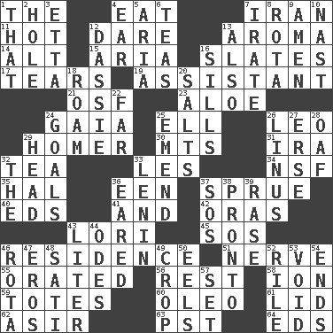 ACROSS 1. Definite Article 4. Erode 7. SW Asia republic 11. Being at a high temperature 12. Have the gumption 13. Scent 14. The first octave above the treble staff 15. Operatic vocal solo 16. Chalkboards 17. Rends 19. Helper 21. Order of Saint Francis (abbr.) 23. Medicinal plant 24. Greek goddess of the earth (variant) 25. Pipe bend 26. Lion 29. Home run 30. Mountains (abbr.) 31. Retirement account (abbr.) 32. Beverage made from leaves 33. French article 34. Overdraft (abbr.) 35. Actor Linden 36. Car or cant ending 37. Disorder 40. Begley and Asner 41. Added to 42. Mouths or openings 43. Australian parrot (variant) 45. Mayday 46. Dwelling 51. Effrontery 55. Declaimed 56. State of inaction 58. Electrically charged atom 59. Lugs 60. Margarine 61. Hat (slang) 62. SW Saudi Arabia district 63. Pacific Standard Time (abbr.) 64. Begley and Asner DOWN 1. Not this but _ 2. Hollow 3. Singer James 4. Ewer handle 5. Operatic vocal solo 6. Beverages made from leaves 7. Feeling or showing extreme anger 8. Round or rotation of duties 9. So be it 10. Political cartoonist Thomas 12. Hyrax 13. In addition 16. Beverly of Met fame 18. Wander aimlessly 20. Table seasonings 22. Distant 24. Finish lines 25. Make improvements or corrections to 26. "_ and Lucy" (Charlie Brown theme song) 27. Celtic language 28. Clumsy lout 29. Froth on beer 32. Definite Article 33. Soviet premier 1918-24 36. Having ears or earlike features 37. Distress signal 38. Right away 39. To erase 43. 61 cubic inches 44. Lyric poems 46. Round or rotation of duties 47. Greek god of love 48. Suttee (variant) 49. Riding implement 50. Snakelike fish 52. Cause heat under the collar 53. Null 54. Extremities 57. Put into a specified state