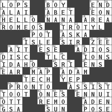 ACROSS 1. Chops off 5. Male child 8. Conclusion 11. Mountain range southwest of Kyrgyzstan 12. Collude with 14. A really long time 15. Phone greeting 17. Grandmother 18. Length times width 19. Lover boys 21. TNT 23. Cooking vessel 25. "____ silly question..." 26. Small island 27. Title for a knight 28. Last letter of the English alphabet 31. Small island 33. Compass dir. 35. Goodbye (Sp.) 37. Compact _ 38. Affectionate concern, for short 40. Charged atoms 41. Potato state 43. Indian title of respect (Mr.) 45. Followers of ems 46. Ewer handle 47. Atlas unit 50. First man 52. Technician 53. Slangy assent 54. Right away 56. Help 61. A blast of a horn 62. Washington bills 65. World-weariness 66. Baseball player Mel 67. San ____ (Riviera town) 68. Arabian gulf 69. Girls' org. (abbr.) 70. Player for Phoenix 71. Airs DOWN 1. Cowardly lion portrayer 2. Butter sub 3. Inside of hand 4. Drop; flow; fall 5. Forbid 6. Chief or king in Benin or Nigeria 7. Gossips 8. Suggestive of the supernatural 9. Christmas carol 10. Heredity factor (abbr.) 13. Tarsus (plural) 16. I made a mistake 18. "One Day ___ Time" 20. Not divided or shared with others 22. Gumbo ingredient 24. Trial 26. Hankering 28. The Jewish people; Israel 29. Immeasurably long periods of time 30. Curvy letter 31. Opera by Verdi 32. Astrian river, tributary to the Danube 34. Raised railways 36. South Vietnam president (1954) 37. Expire 39. Supercomputer manufacturer 42. Sign of something about to happen 44. It may be bright or harebrained 48. Thespian 49. Gives a jingle 51. Domed church section 52. Small child 54. Cooking vessels 55. Roll call or roster of names 57. Fastener 58. Southeast Asian peninsula 59. Takes to court 60. Prong on a fork 61. Coat; cloak 63. Australian flightless bird 64. Male offspring