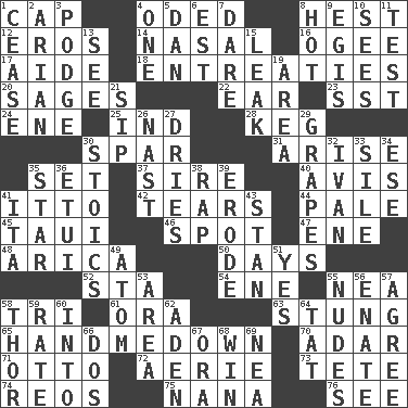 ACROSS 1. Head covering 4. Wrote a lyric poem 8. Behest 12. Greek god of love 14. Rhinal 16. Double curve, resembling the letter S 17. Assistant 18. Pleas 20. Gurus 22. Ewer handle 23. Fast jet (abbr.) 24. Compass dir. 25. Indiana (abbr.) 28. Cask 30. Practice fight 31. Ascend 35. Arrange properly for use 37. Title for a man of rank and authority 40. Advice 41. "Tell ____ the Marines!" 42. Separates forcefully 44. Light colored 45. "Change" in Tahitian 46. Specific locale 47. Compass dir. 48. N. Chile seaport 50. 24-hour periods 52. R.R. building 54. Compass dir. 55. Teachers' org. 58. Three (prefix) 61. Mouth or opening 63. Feeling sharp psychological pain 65. Sleeping bag shop? 70. The sixth month of the Jewish calendar 71. Von Bismarck 72. Nest on high 73. False hair 74. Vintage cars 75. Nanny 76. Perceive with the eye DOWN 1. Desist 2. Believer in; advocate of (suffix) 3. Plash 4. Single 5. One of the 12 tribes of Israel 6. Eastern Standard Time (abbr.) 7. Have the gumption 8. Being at a high temperature 9. Armor plate that protects the chest 10. Perceives with the eye 11. Trial 13. Observe 15. Path through which fluid escapes 19. Type of rug 21. Small drink 26. Political cartoonist Thomas 27. Frees from moisture 29. Wine fruits 30. Unemotional ones 32. "Terrible" tsar 33. Filth; sediment 34. Compass dir. 35. Play the lead 36. Needle holder 38. Reproach for some lapse or misdeed 39. Wear away 41. Call ___ day 43. Comedian Laurel of Laurel & Hardy 49. Tiny particle 51. It is so 53. Length times width 55. Unclothed pictures 56. Related on the mother's side 57. Match 58. Son of Odin 59. Assign a rank or rating to 60. To the inside or interior of 62. An important port of Yemen 64. Make lace 66. Two (Sp.) 67. Mouth or opening 68. Acquire through effort 69. Teachers' org.